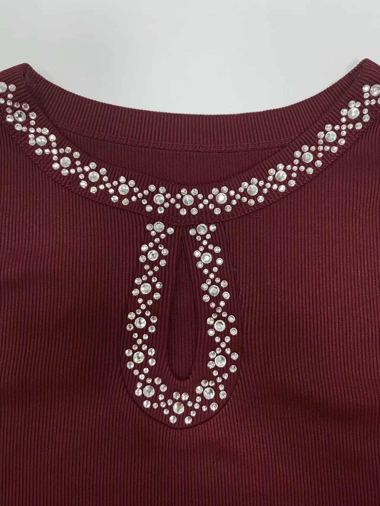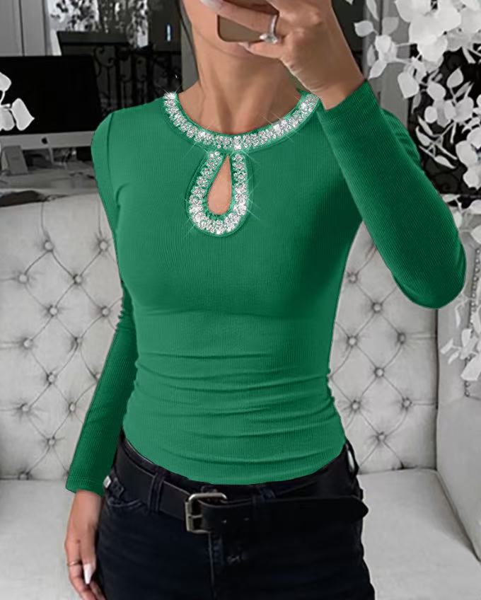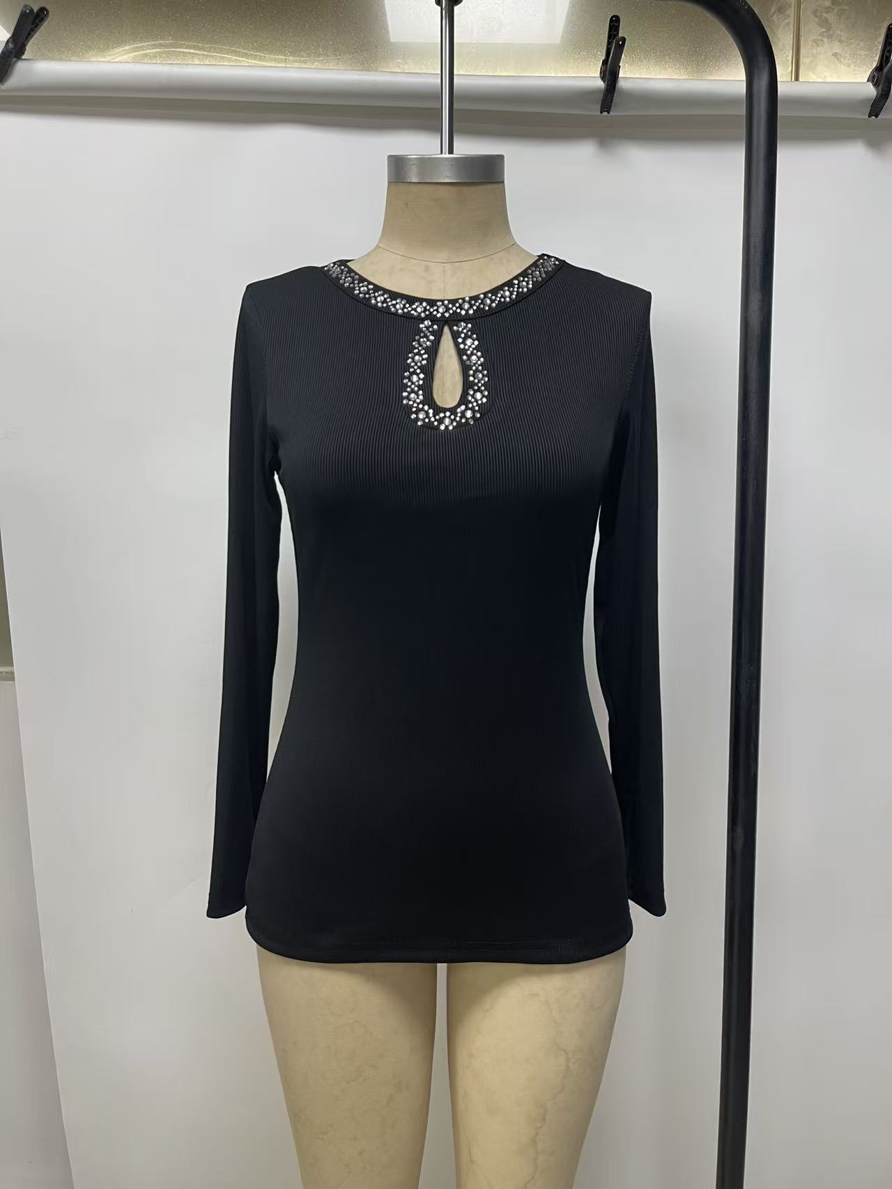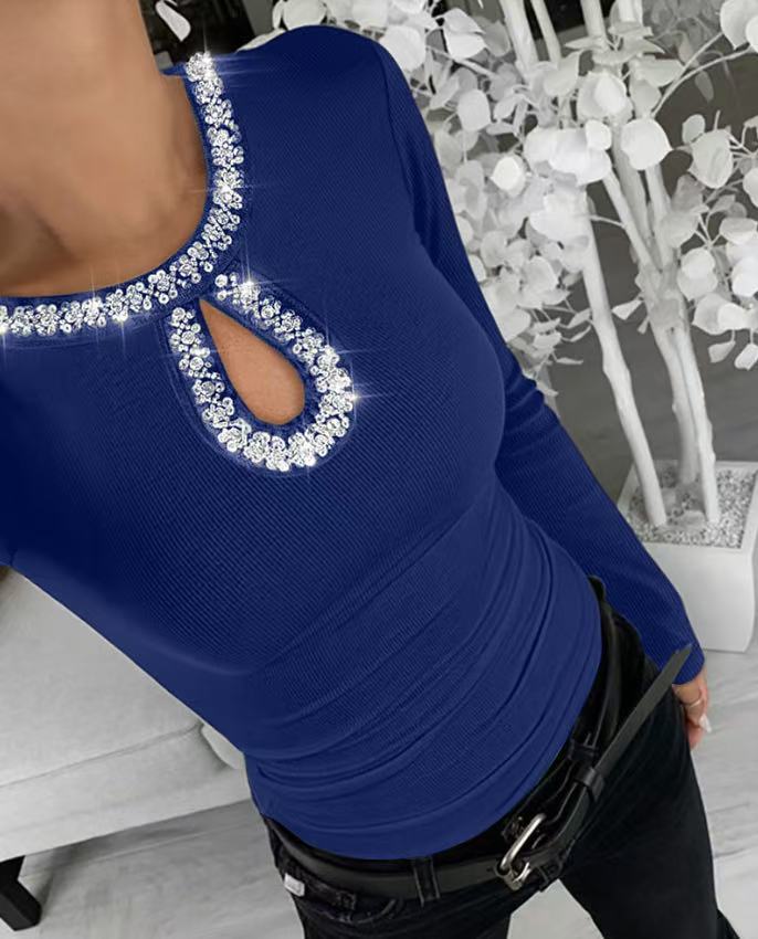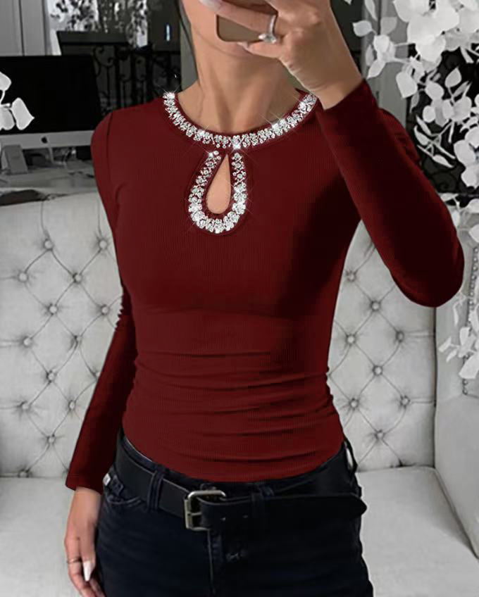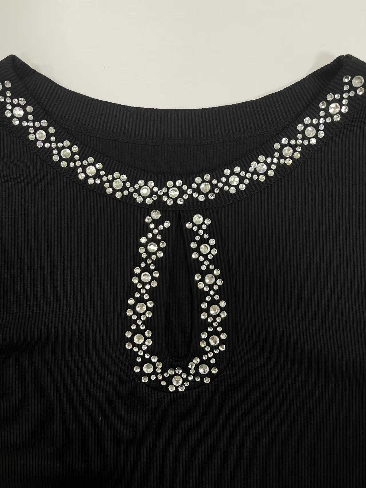 0 Review for 3D Rhinestone Embellished Crewneck Ribbed Long-sleeve Top