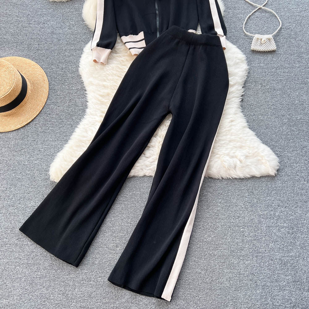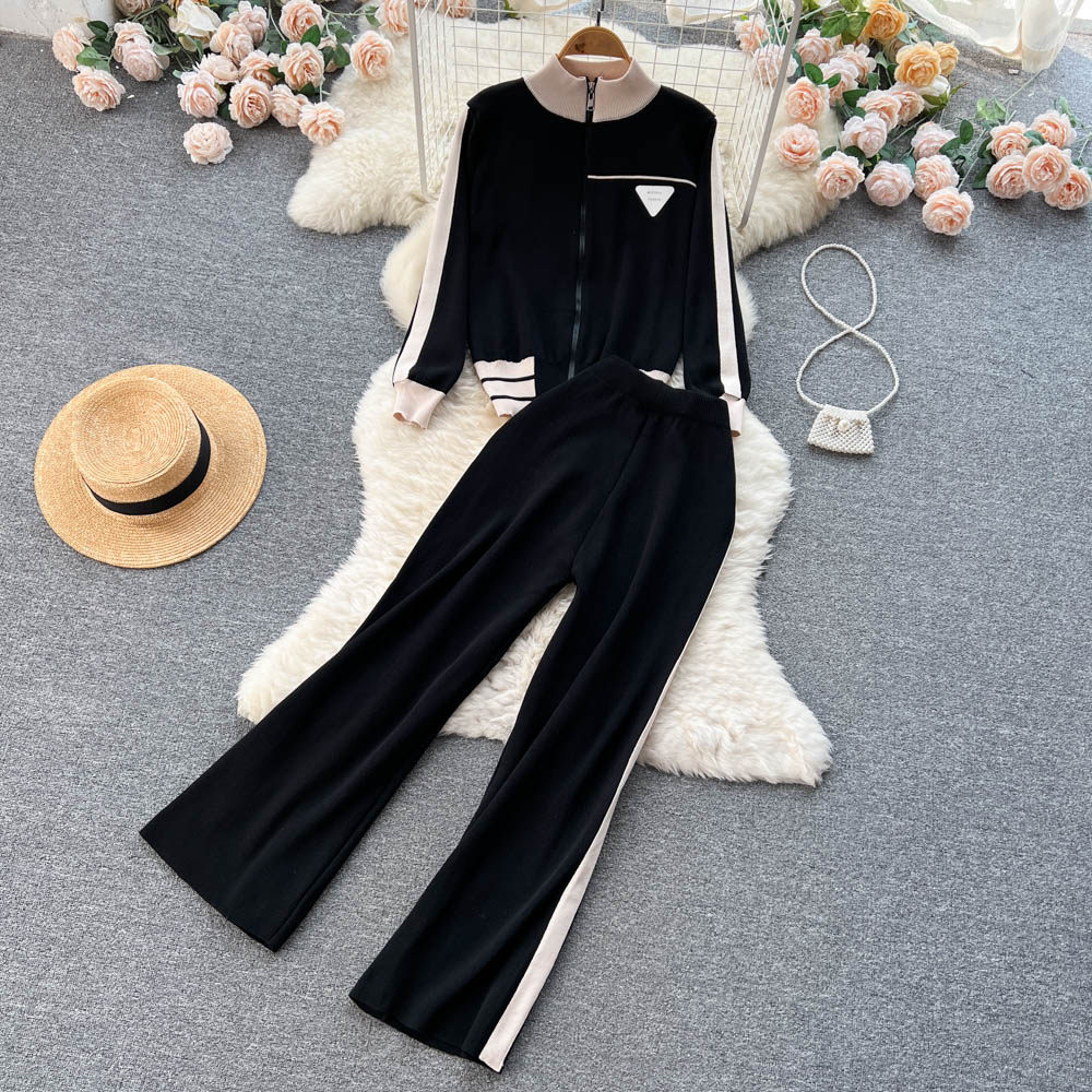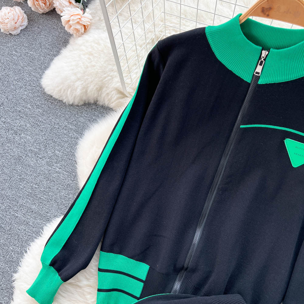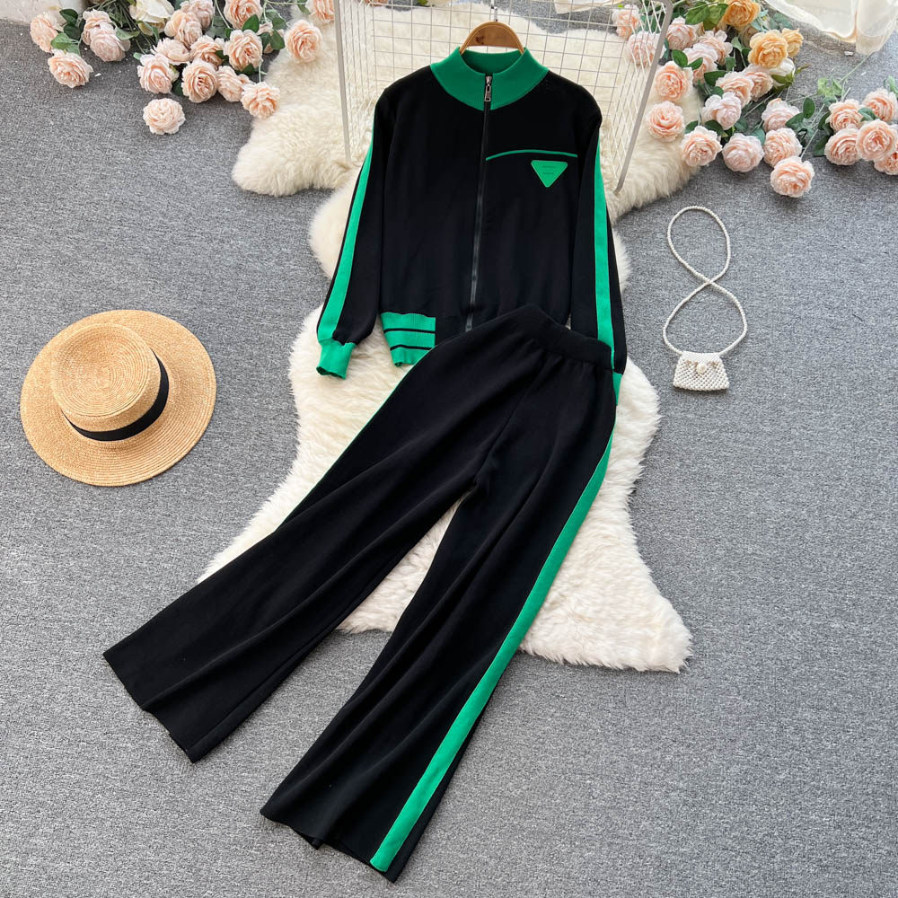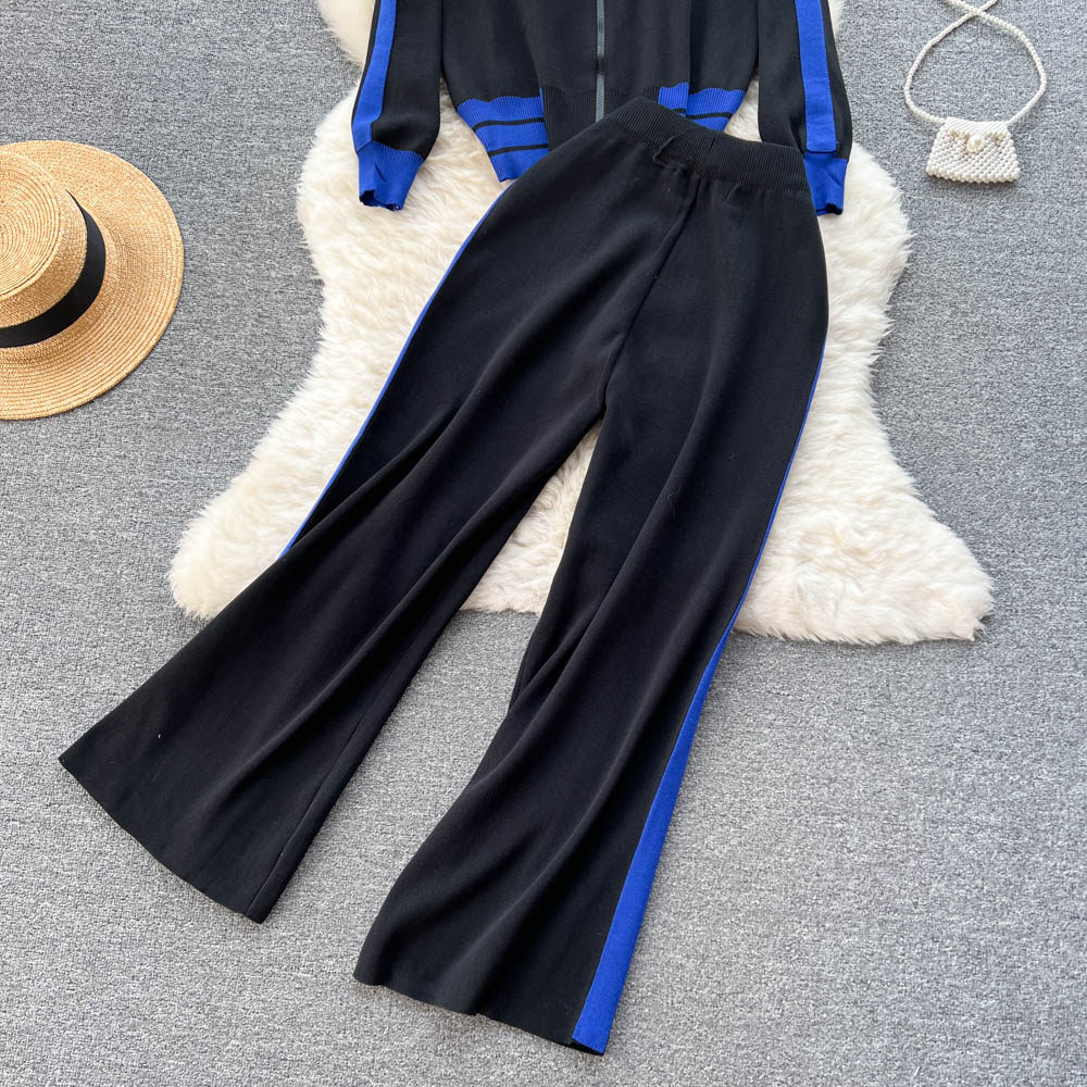 Athletic Contrast-color Long-sleeve Baseball Jacket And Casual Pants Set