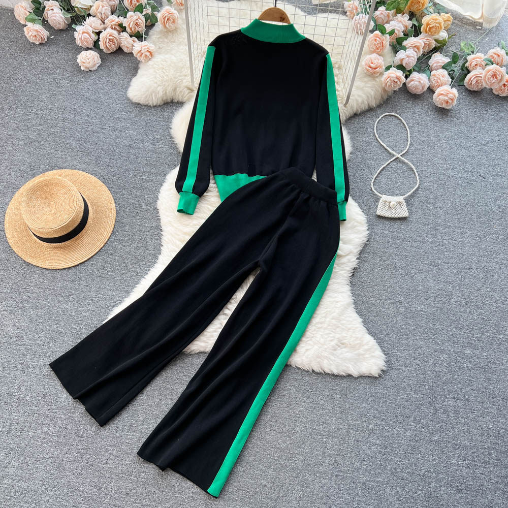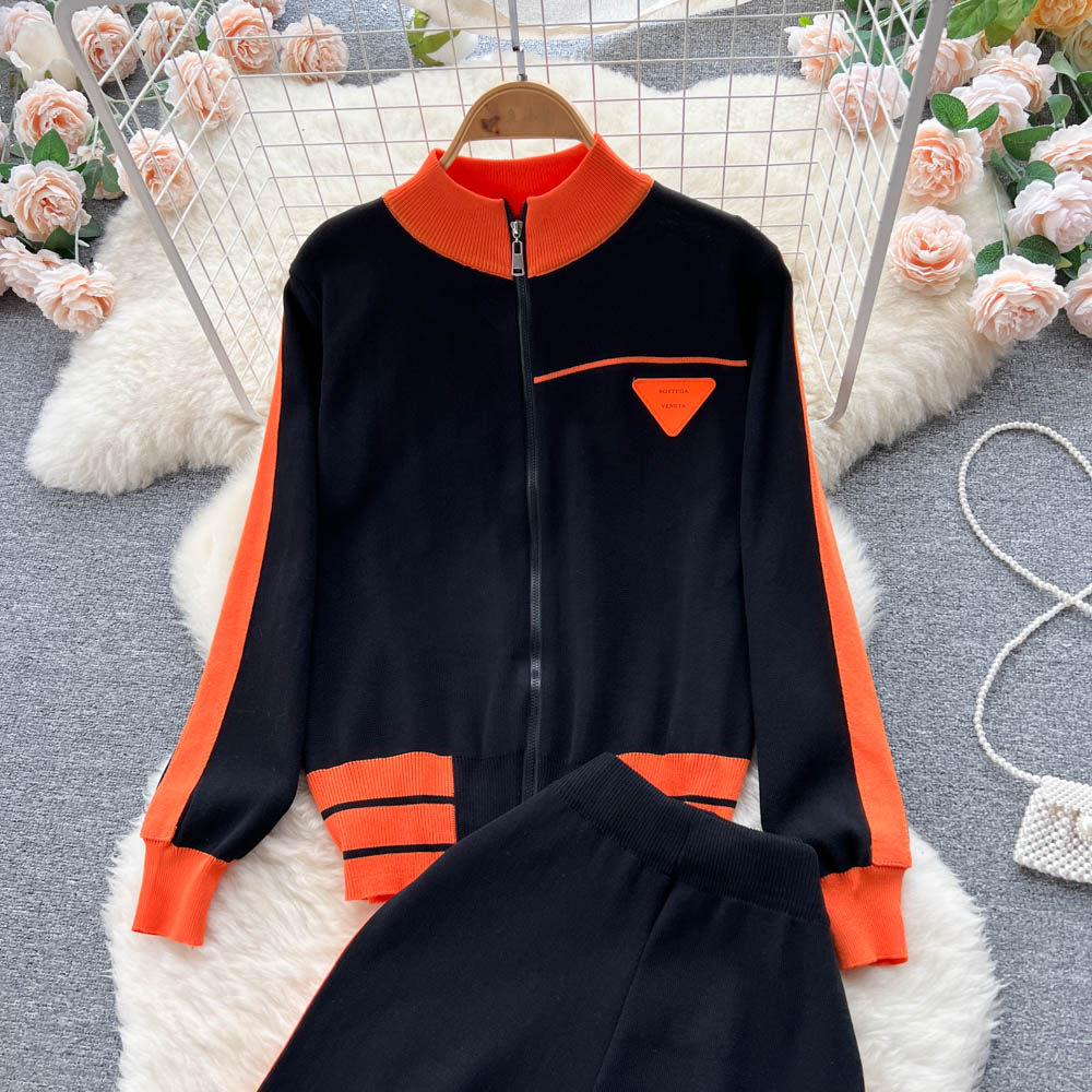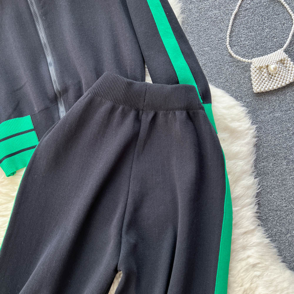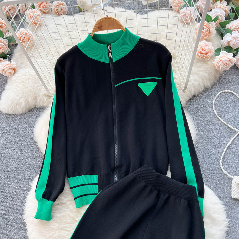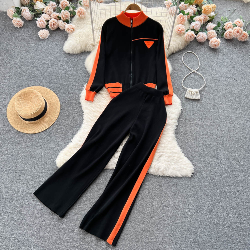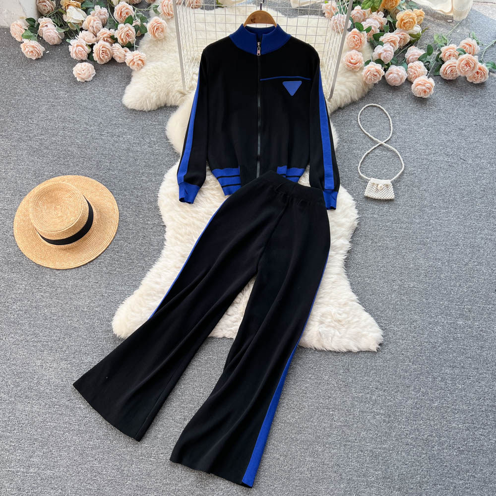 Athletic Contrast-color Long-sleeve Baseball Jacket And Casual Pants Set