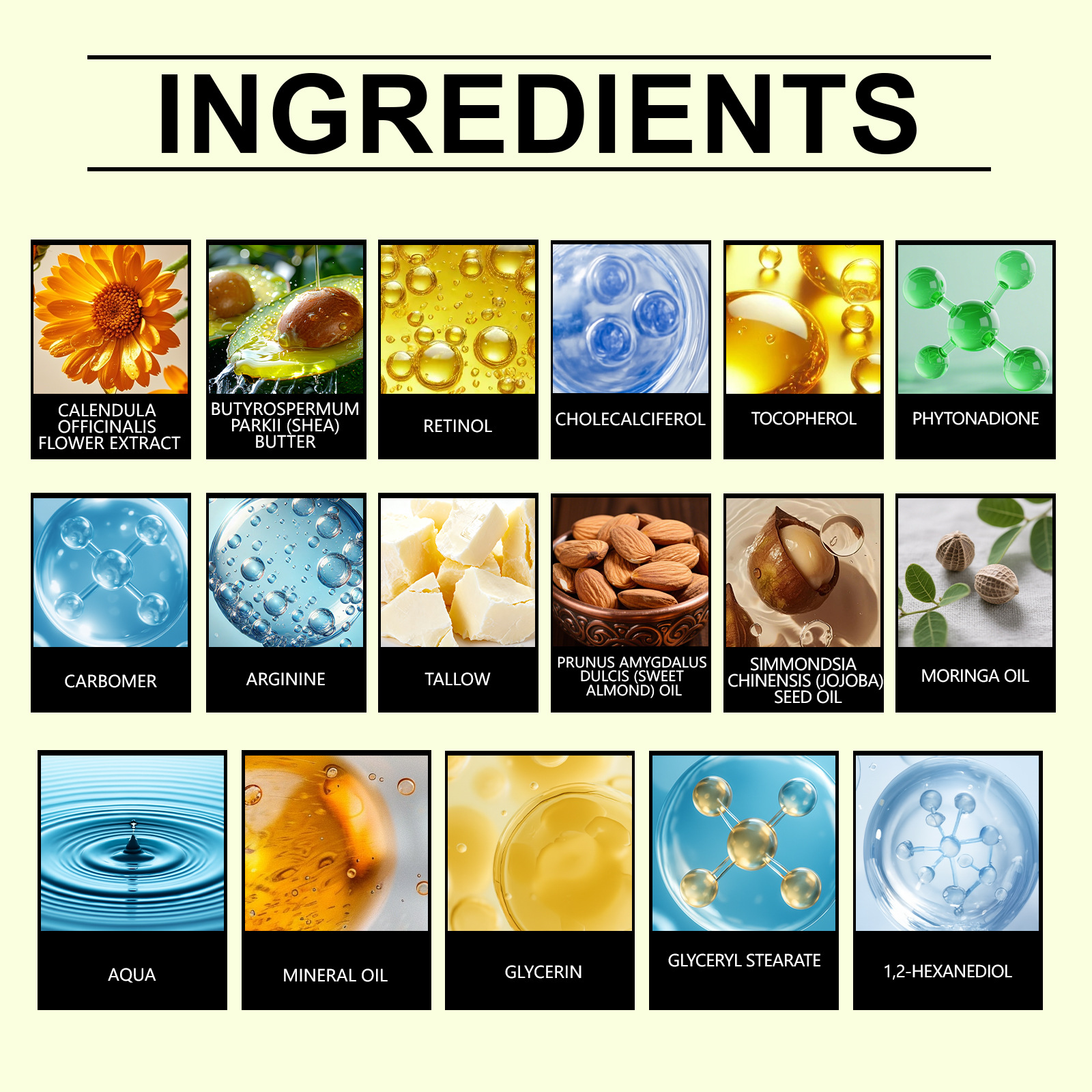 Ingredients: water, mineral oil, glycerin, glyceryl stearate, 1,2- hexanediol, carbomer, arginine, tallow, sweet almond oil, jojoba seed oil, Moringa oil, calendula extract, shea butter, retinol, cholecalciferol, tocopherol (vitamin E) and chlorophyllin.