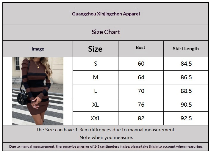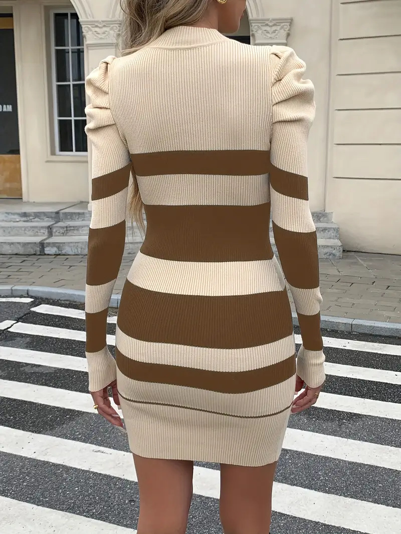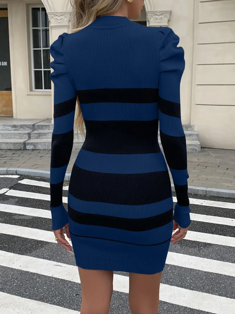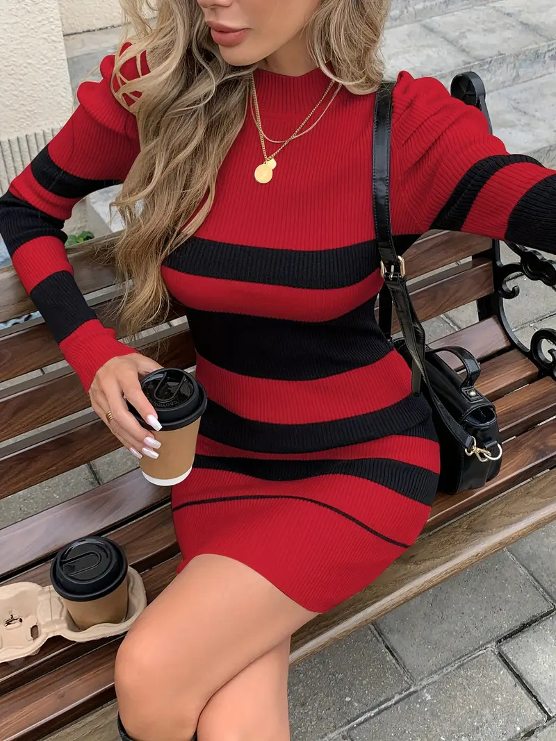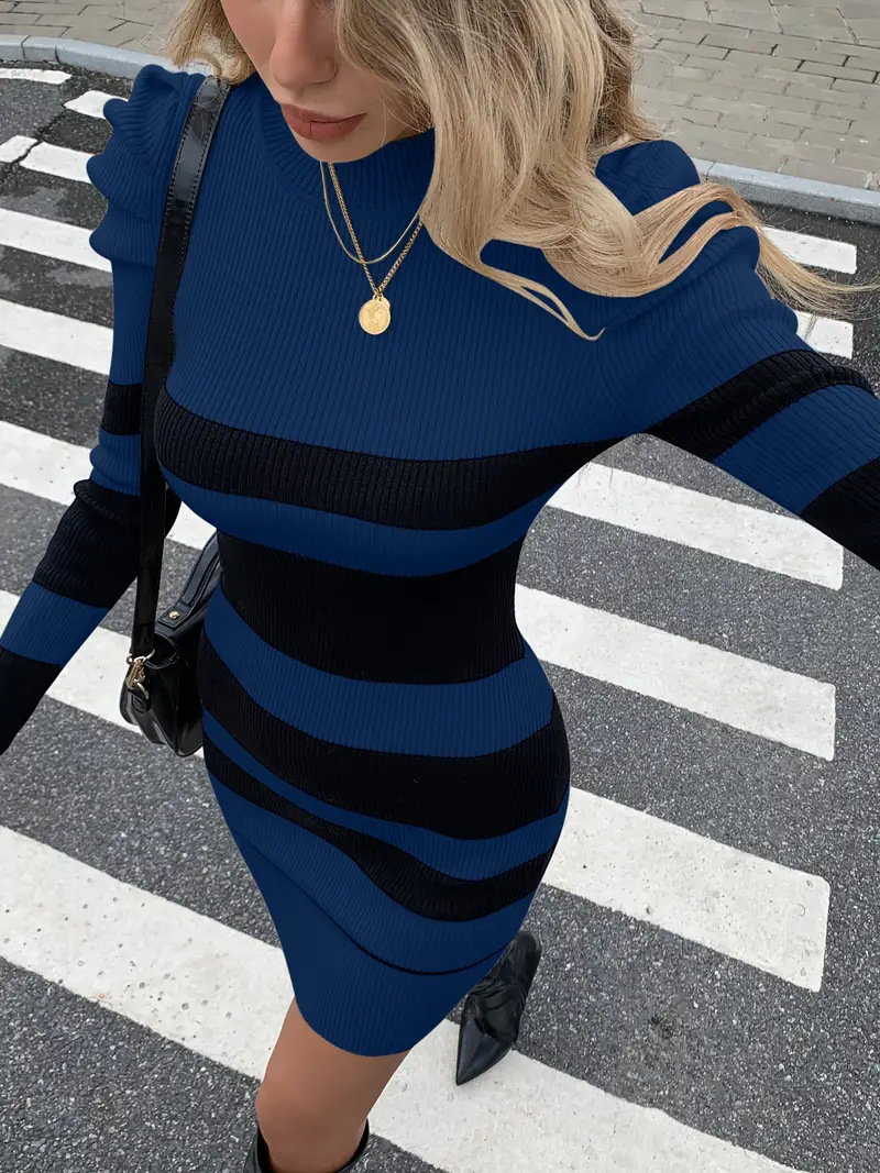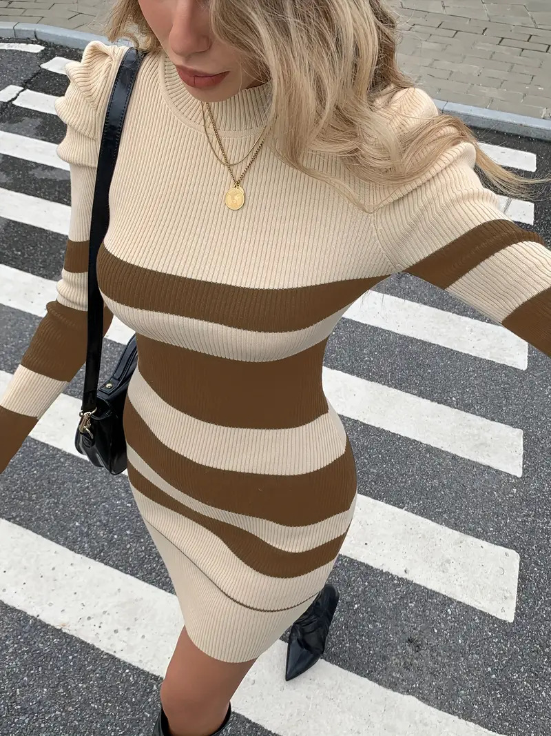 Casual Waist-Cinched Slim-Fit Two-Tone Striped Contrast-Color Sweater Dress For Women
