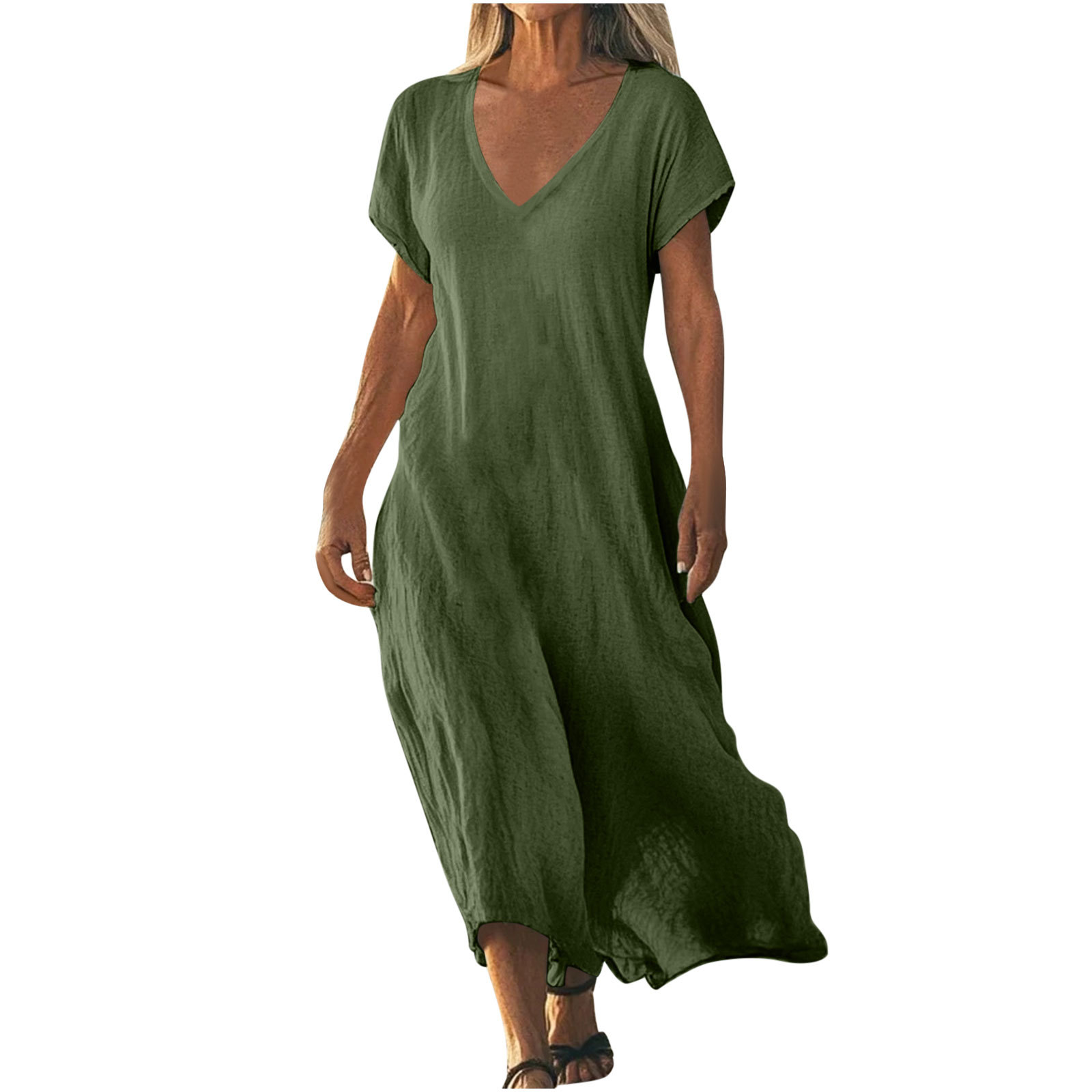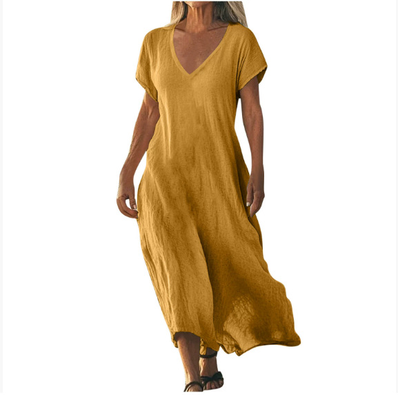 0 Review for Cotton Linen V-neck Short Sleeve Loose Dress Women's Clothing