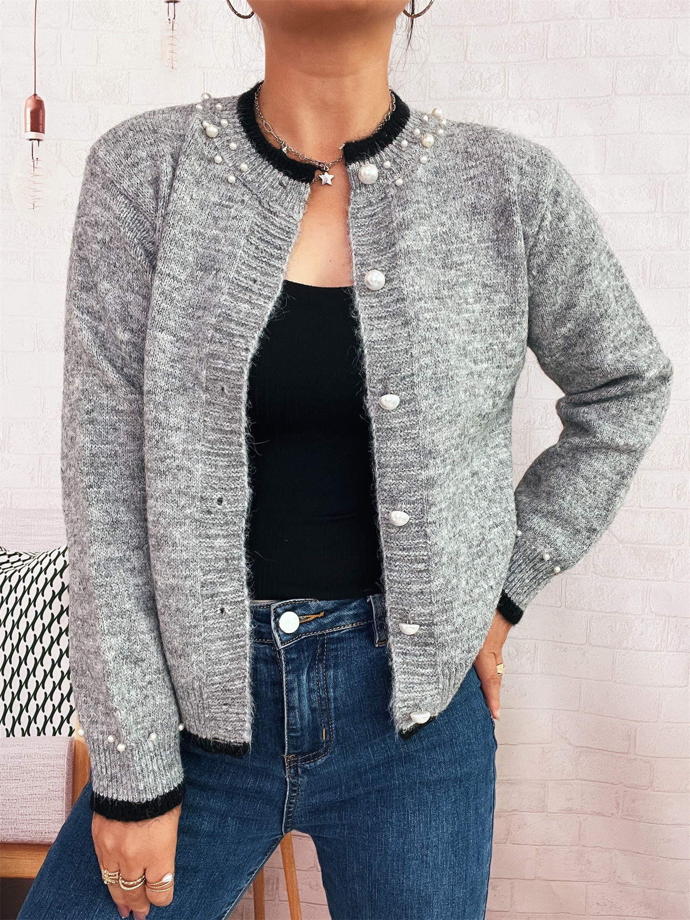 0 Review for Elegant Pearl Button Color Effect Collar Knitted Coat Solid Color Sweater