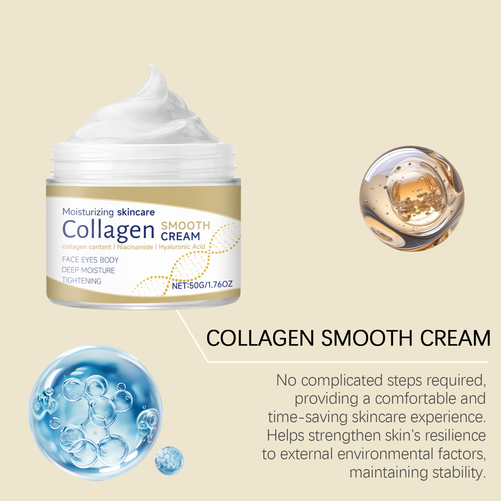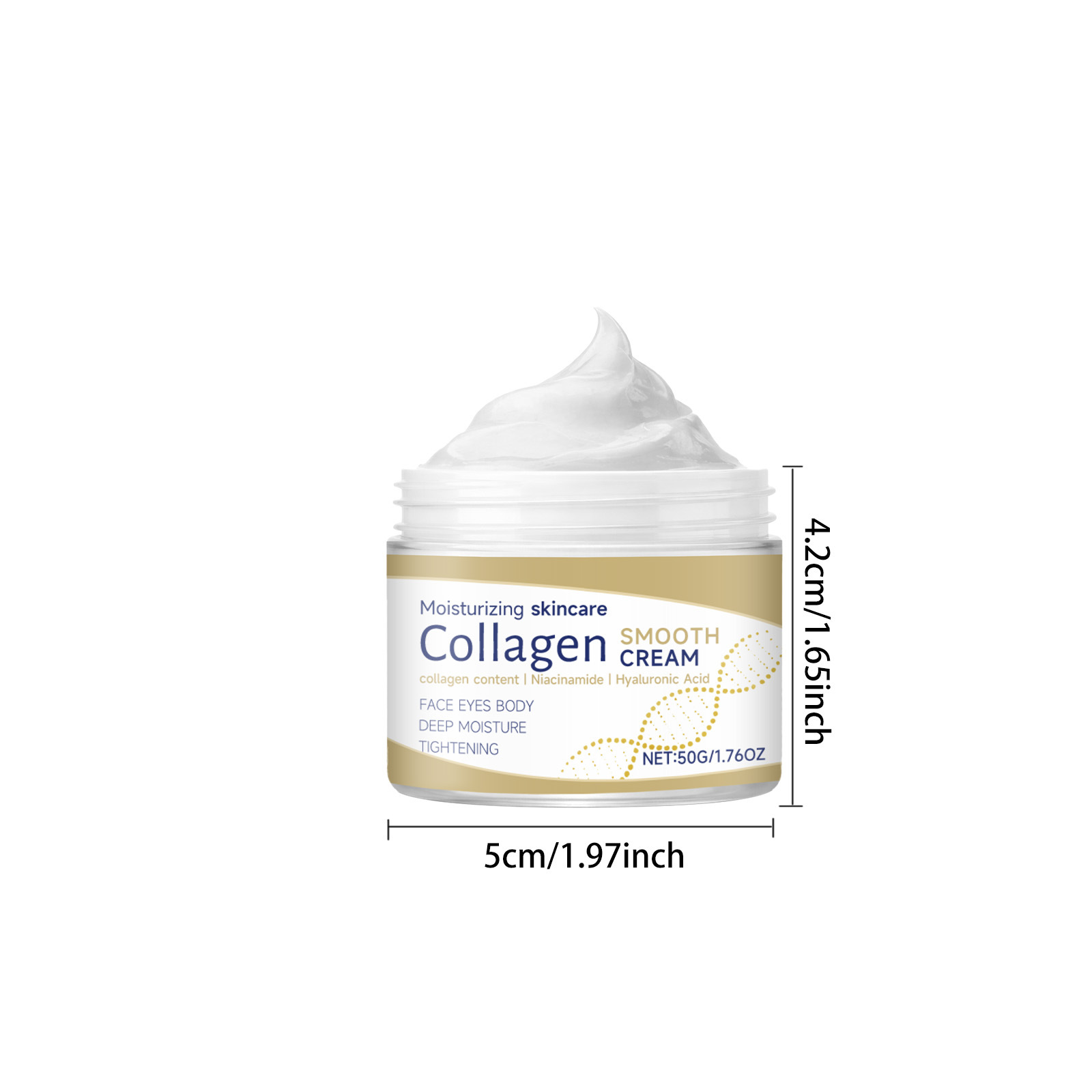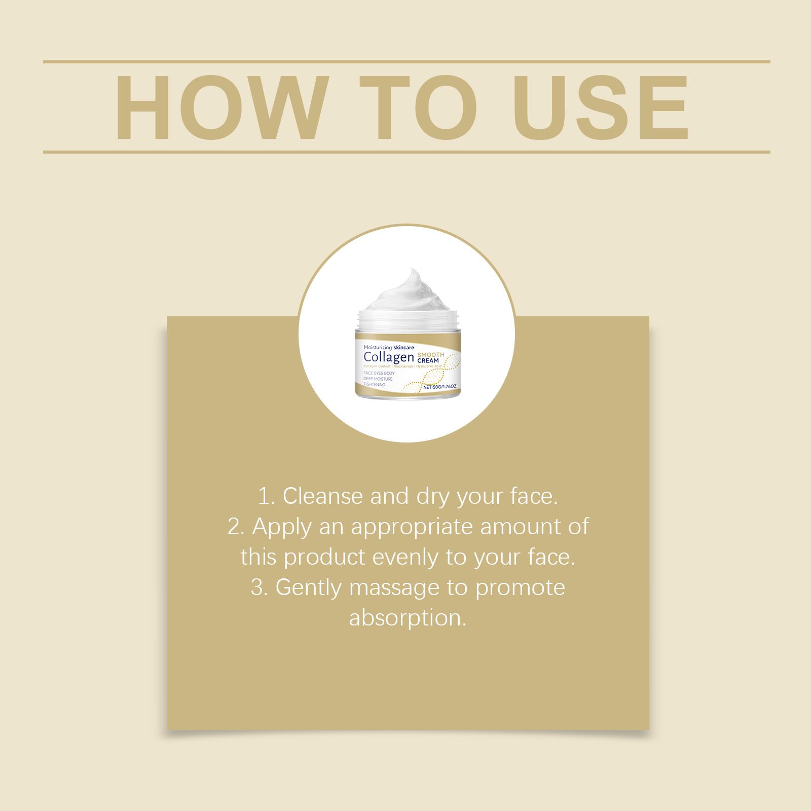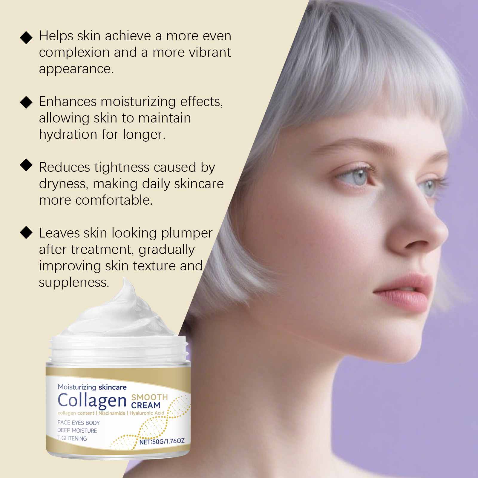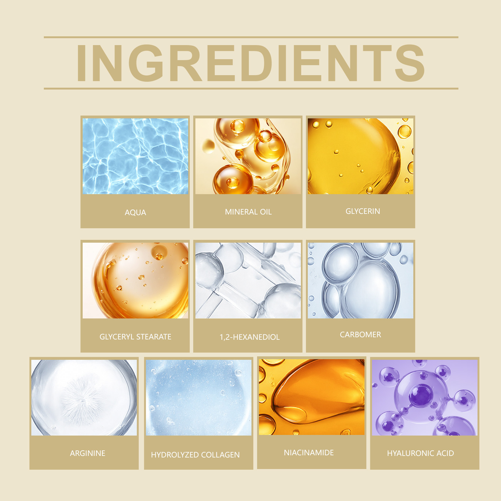 Ingredients: water, mineral oil, glycerin, glycerol stearate, 1,2- hexanediol, carbomer, arginine, hydrolyzed collagen, nicotinamide, hyaluronic acid.