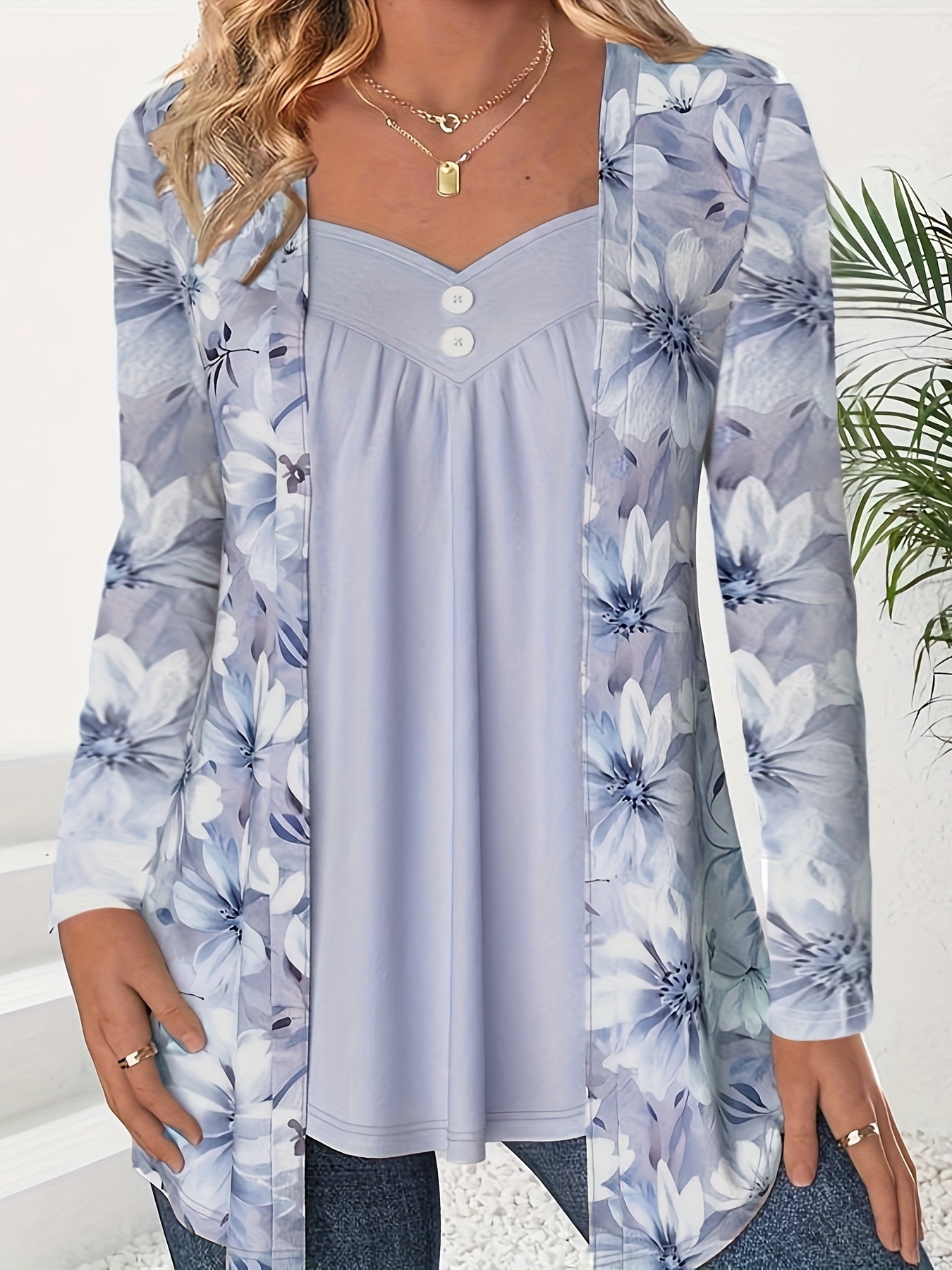0 Review for Fashionable Two-in-One Printed Long-Sleeve Top With Buttons