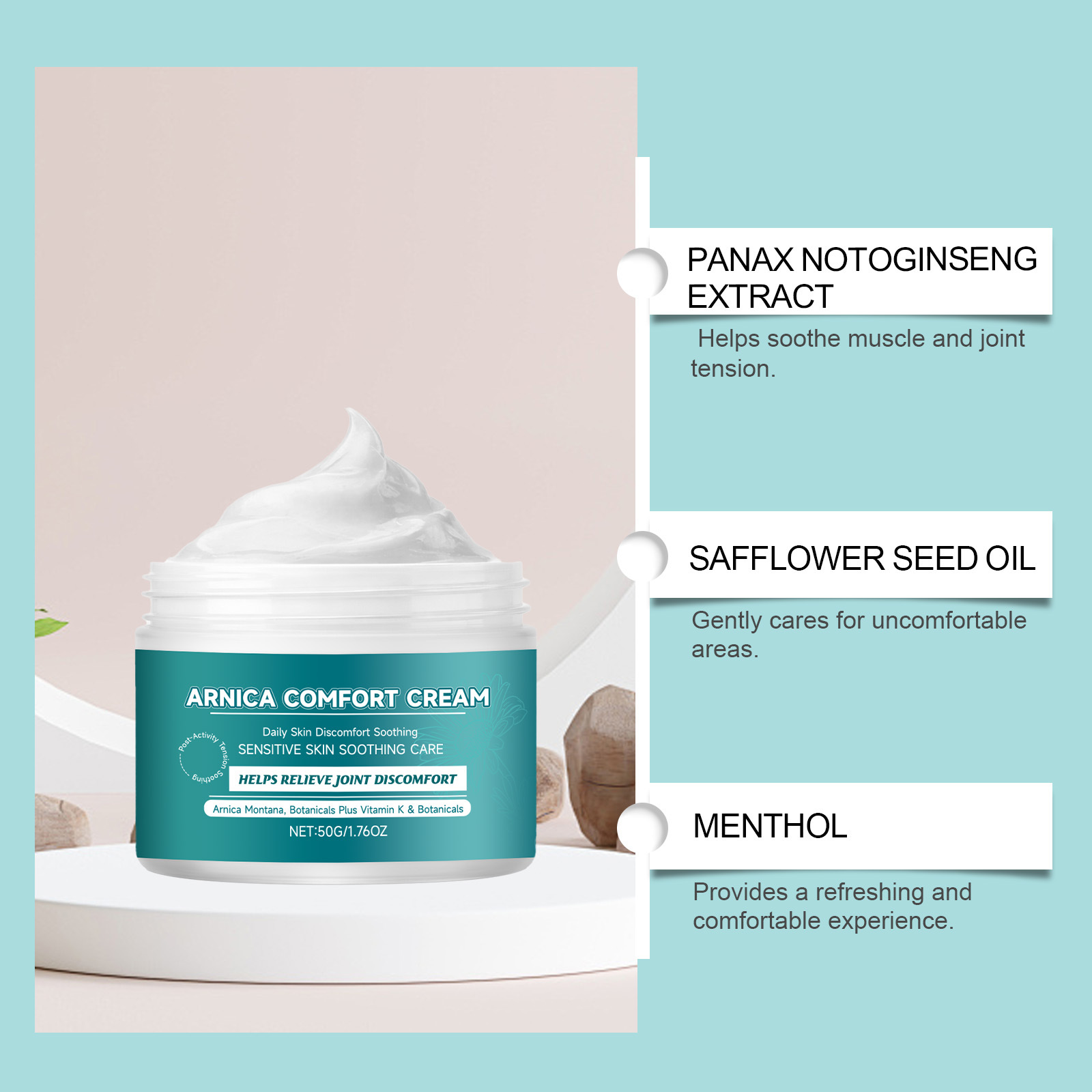 Active ingredients: Panax notoginseng extract, safflower seed oil, menthol, tocopherol (vitamin E)
