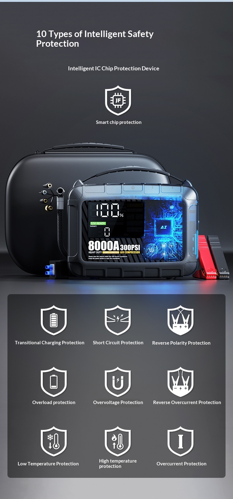 Protection Types: Short-circuit and reverse-polarity protection; no risk from incorrect wiring; low-voltage protection to prevent over-discharge of the battery.