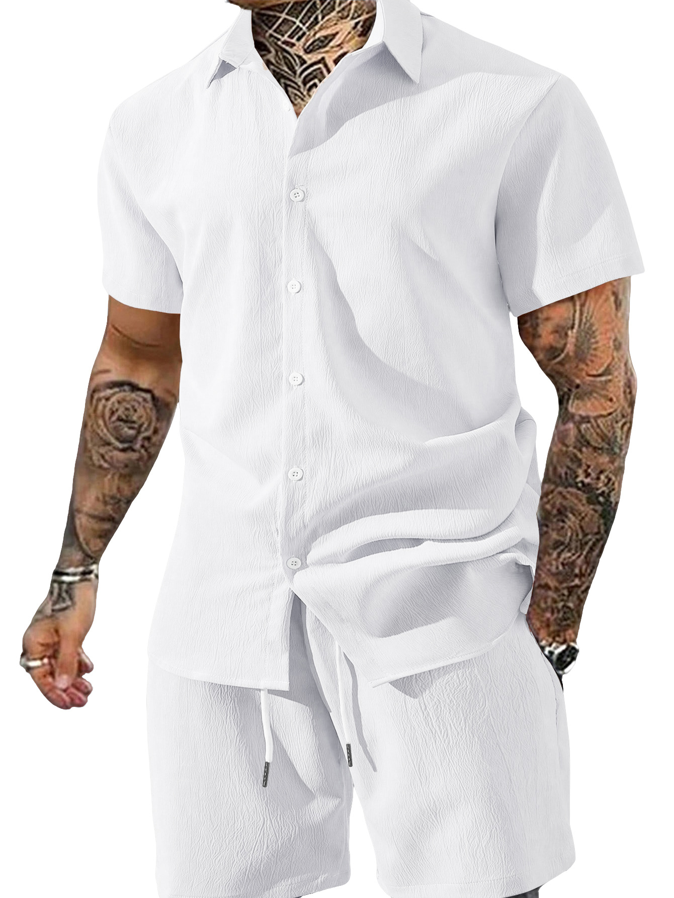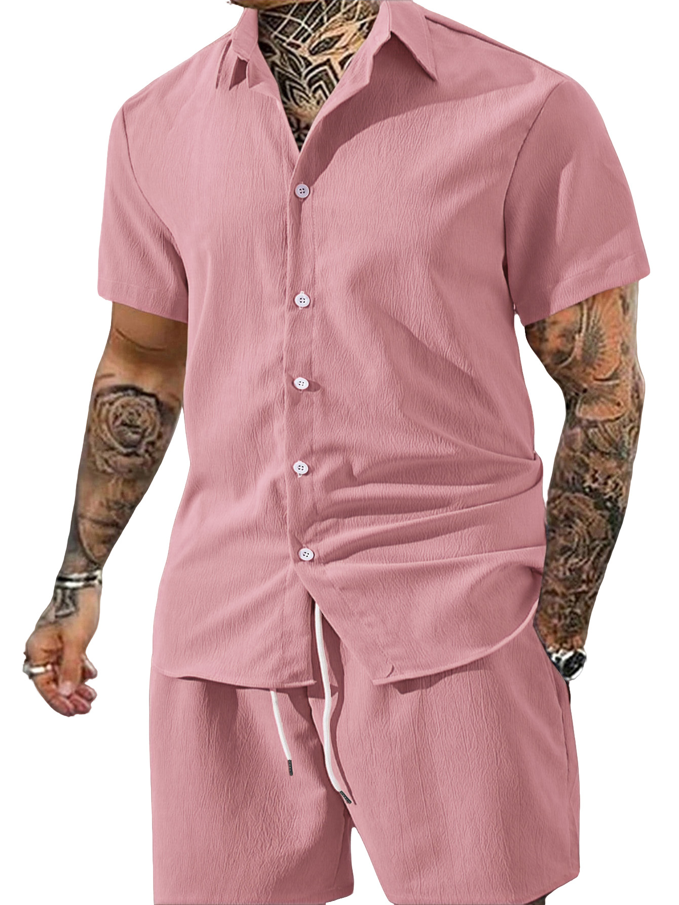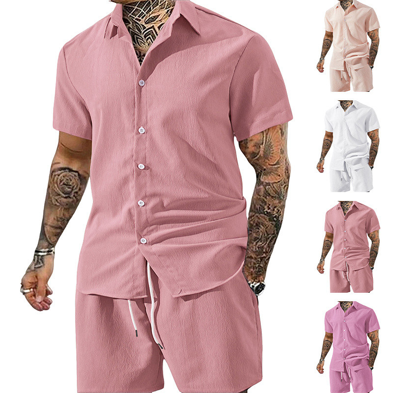 0 Review for Men's Solid Color Lapel Short-Sleeve Shirt And Shorts Set
