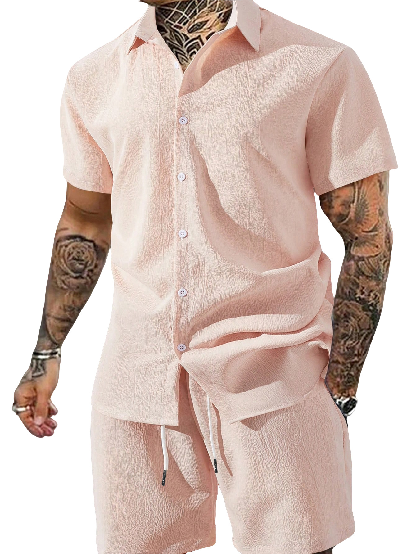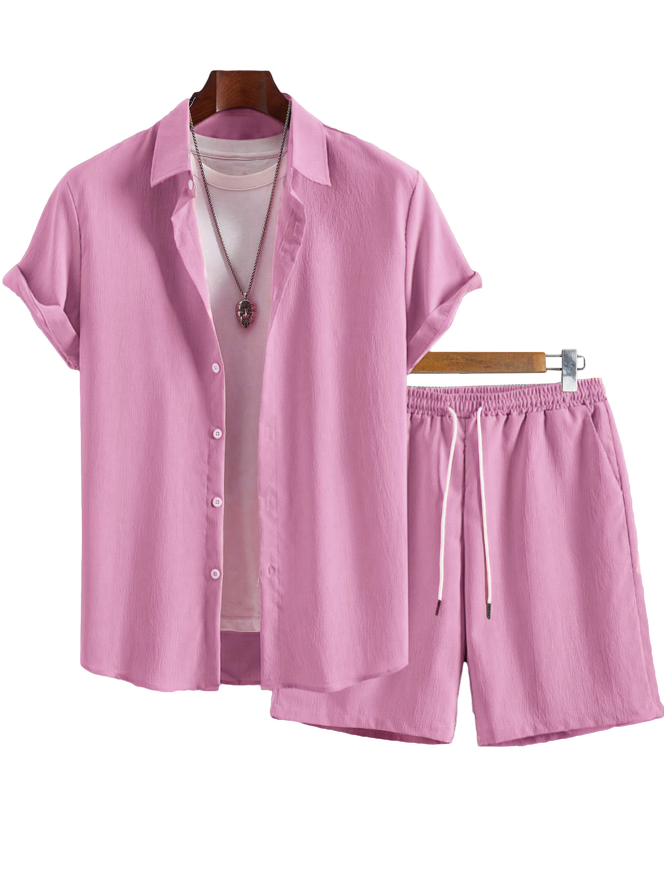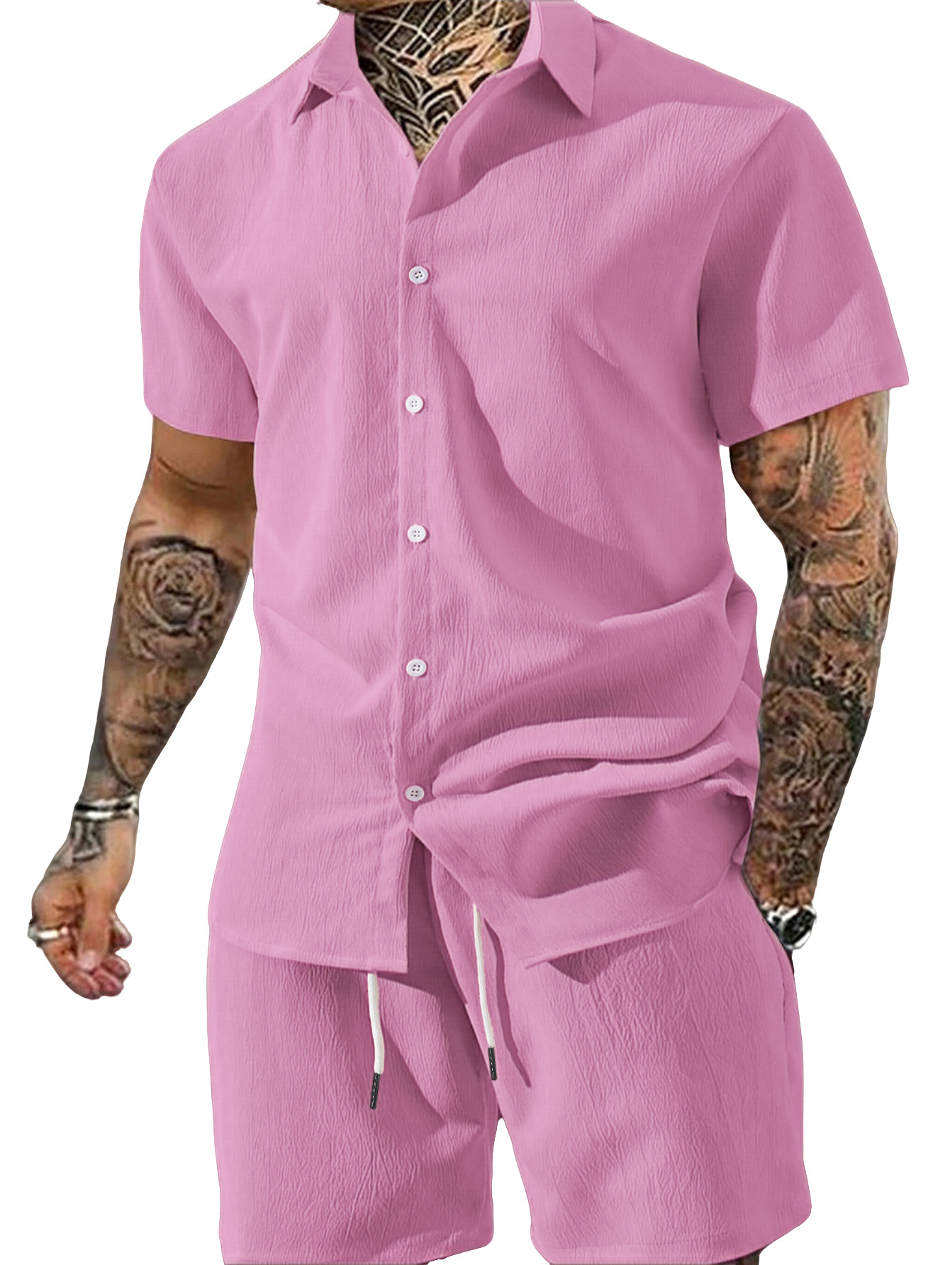 0 Review for Men's Solid Color Lapel Short-Sleeve Shirt And Shorts Set