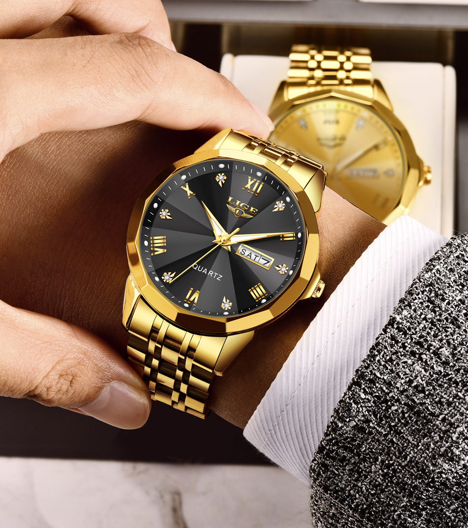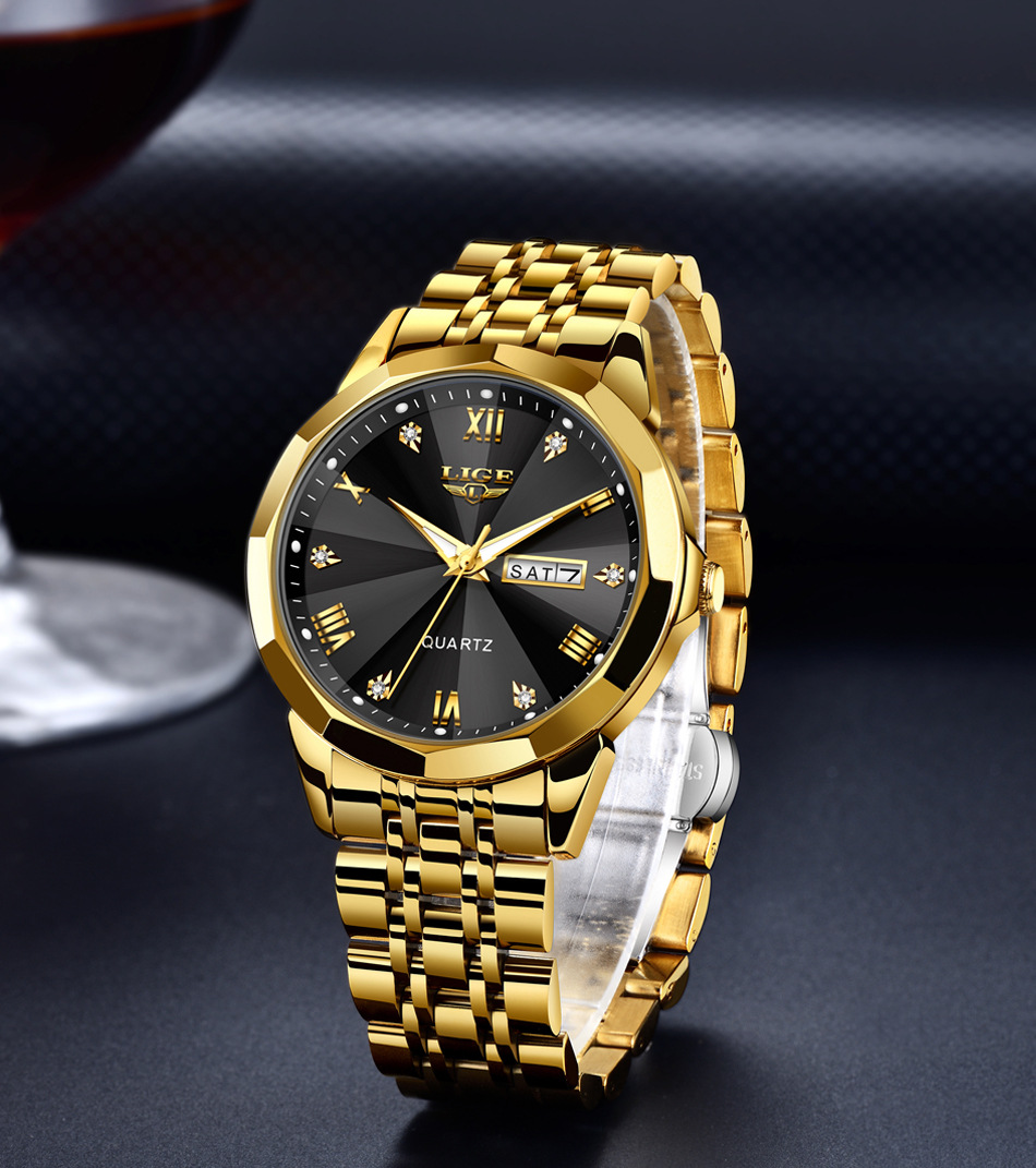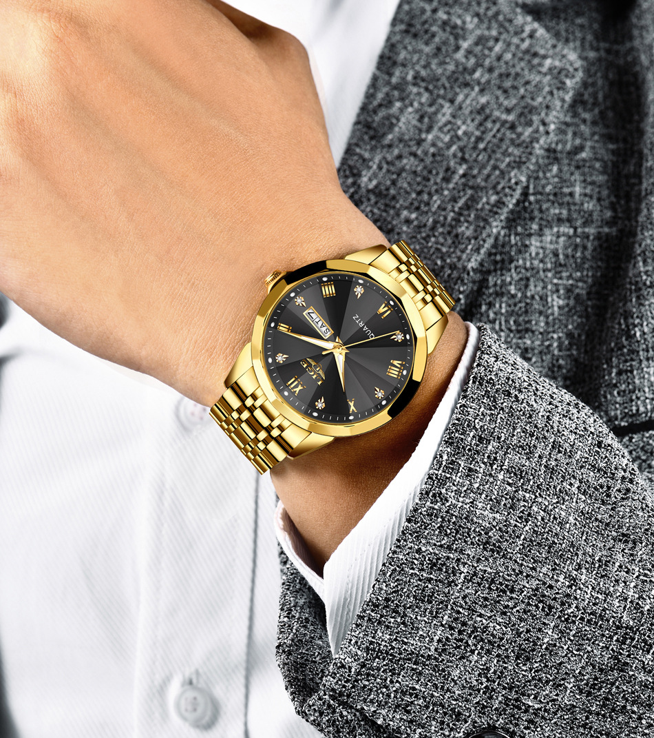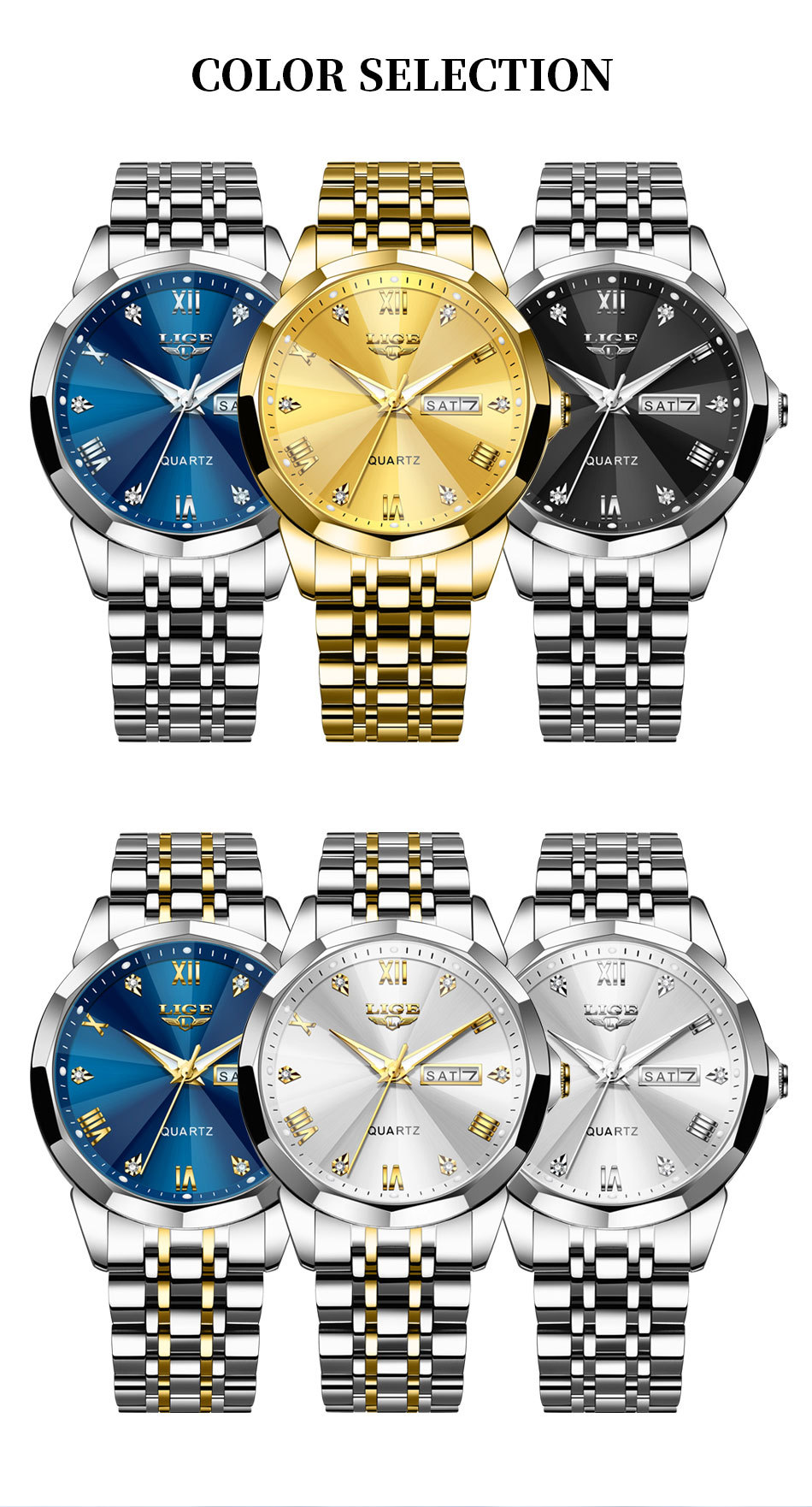 Colors: Silver-black steel band, alternating gold-silver-blue steel band, silver-blue steel band, alternating gold-silver-white steel band, silver-white steel band, all-gold steel band, gold-black steel band