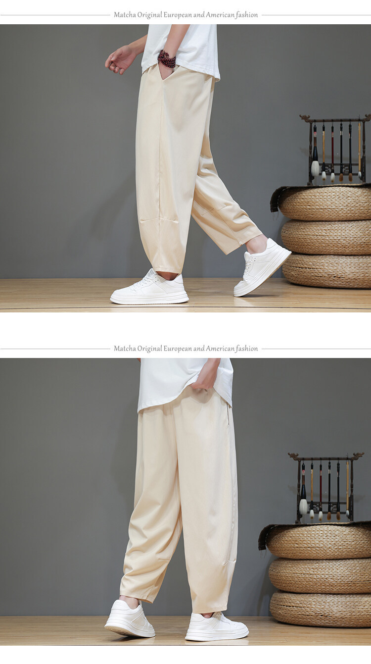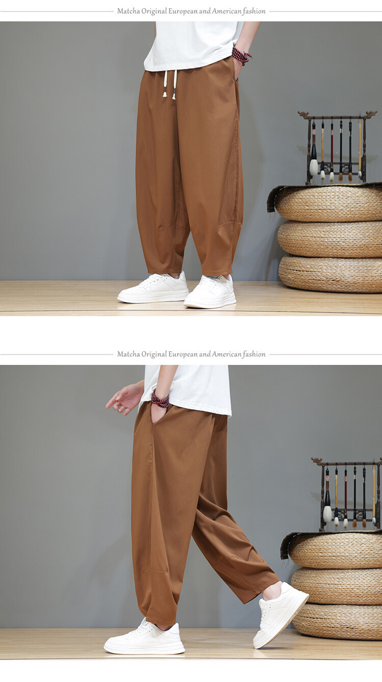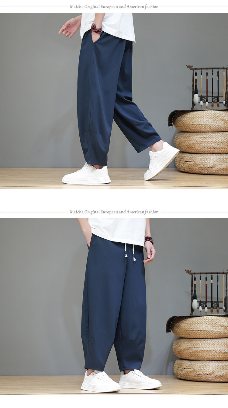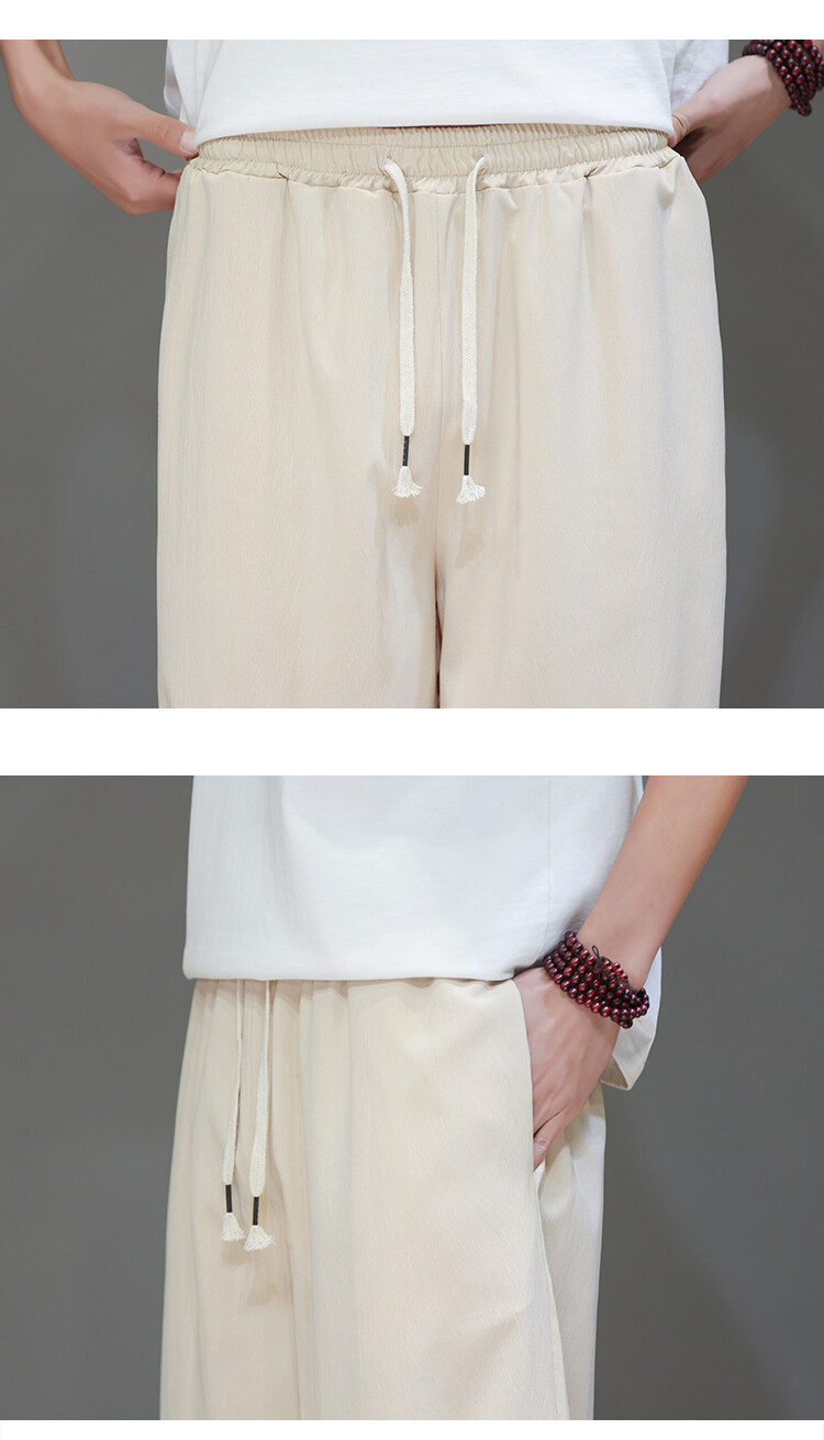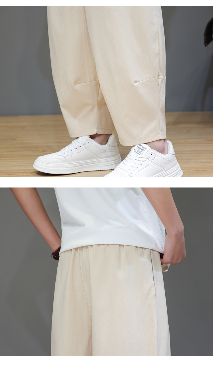 Mens Summer Cropped Pants Lightweight Ice Silk Wide-Leg Casual Trousers