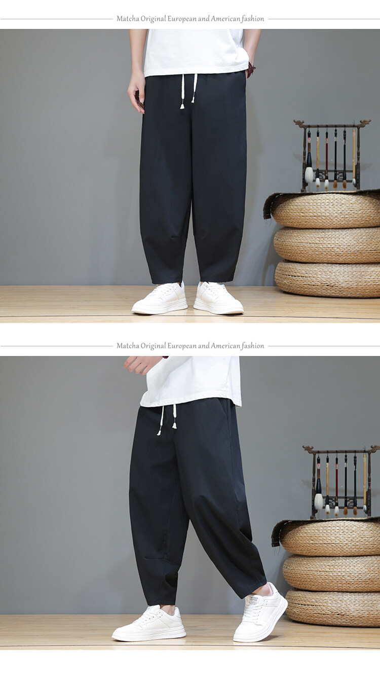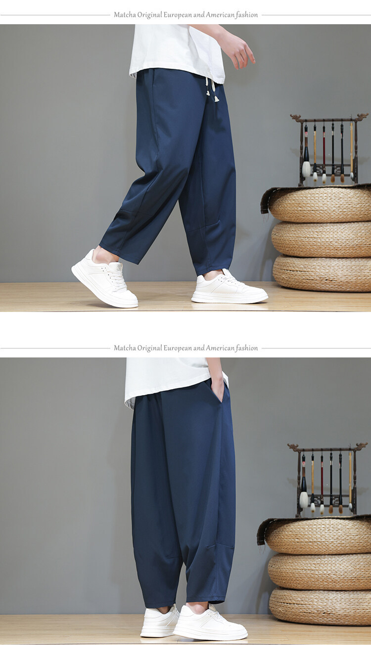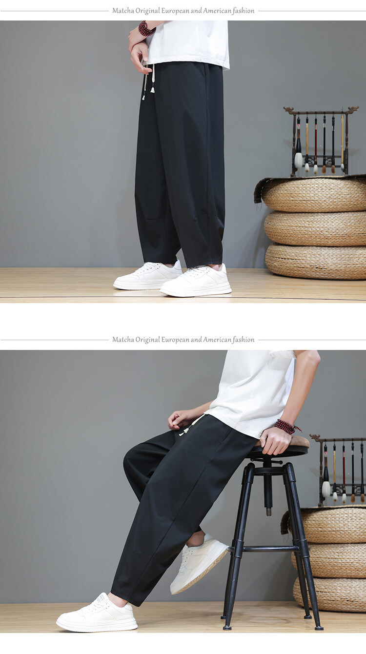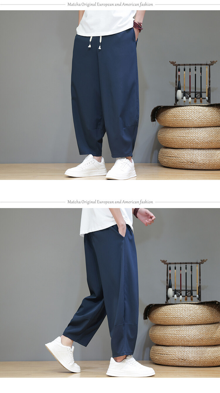 Mens Summer Cropped Pants Lightweight Ice Silk Wide-Leg Casual Trousers