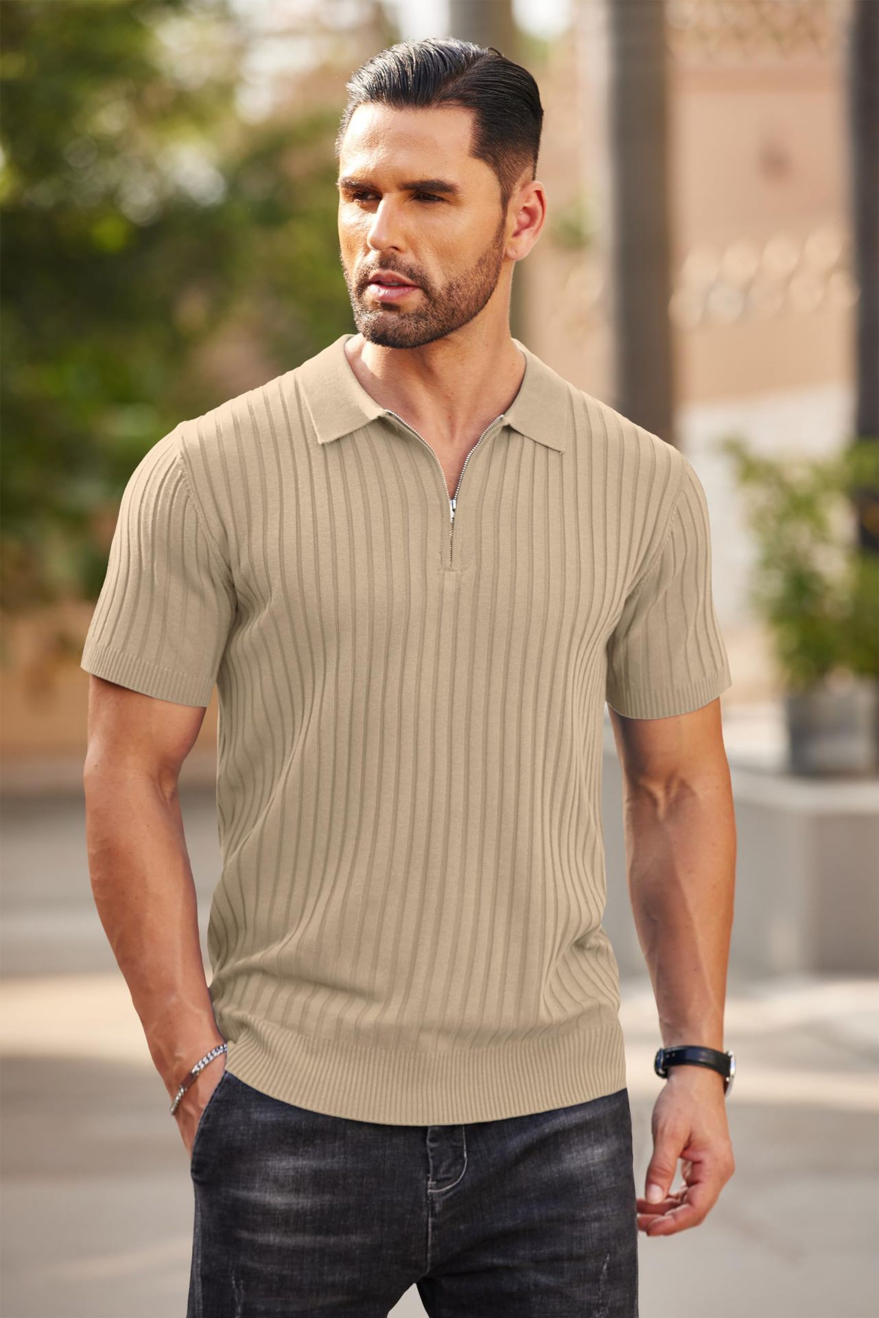 0 Review for Mens Zip-Up Short-Sleeve Rib-Knit Polo T-Shirt Fashionable Casual Golf Shirt