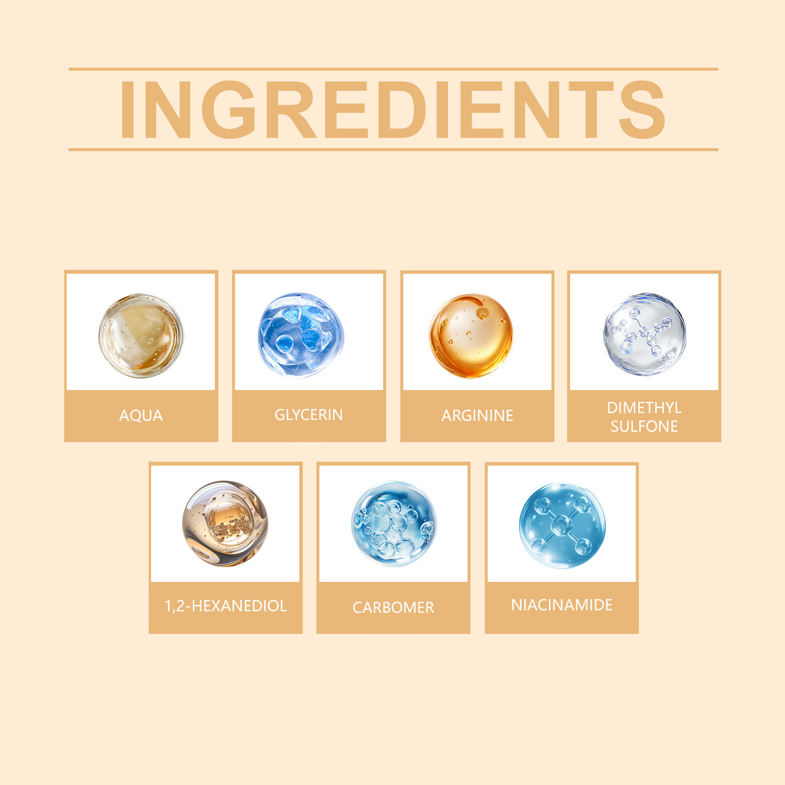 Ingredients: water, glycerin, 1,2- hexanediol, carbomer, arginine, dimethyl sulfone, nicotinamide.