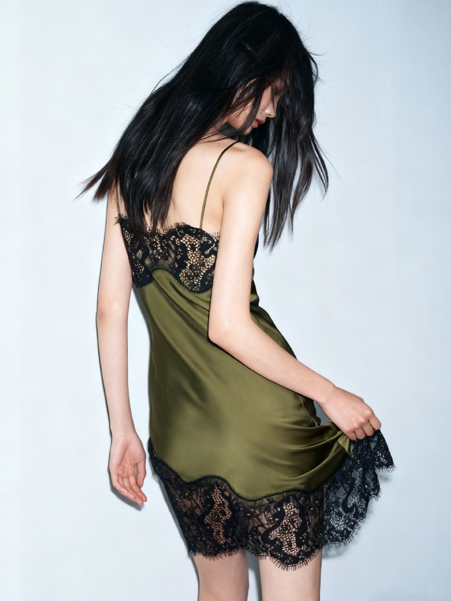 0 Review for Olive Green Satin Patchwork Lace Slip Dress