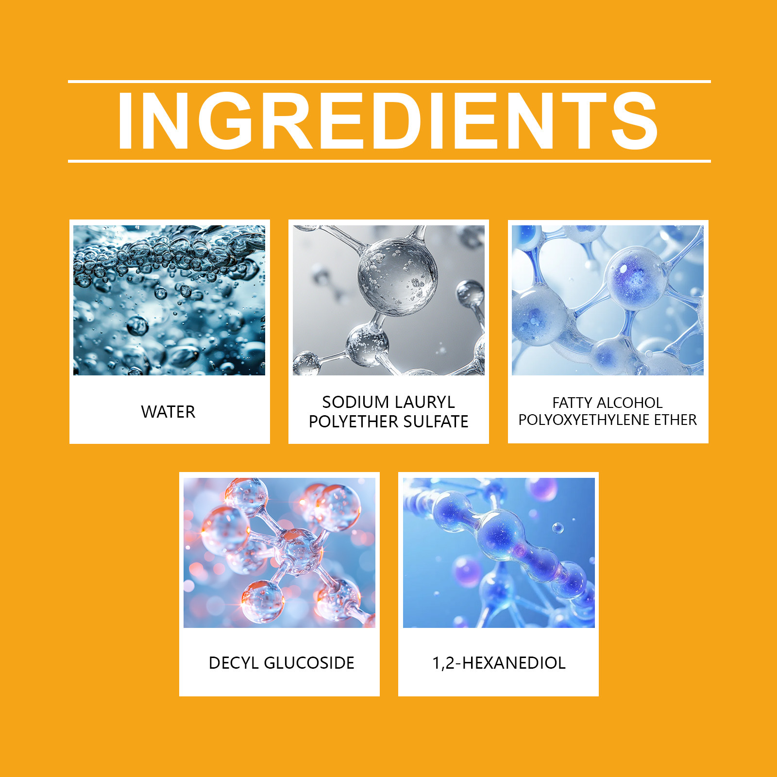 Ingredients: water, sodium lauryl polyether sulfate, fatty alcohol polyoxyethylene ether, decyl glucoside, 1,2- hexanediol.