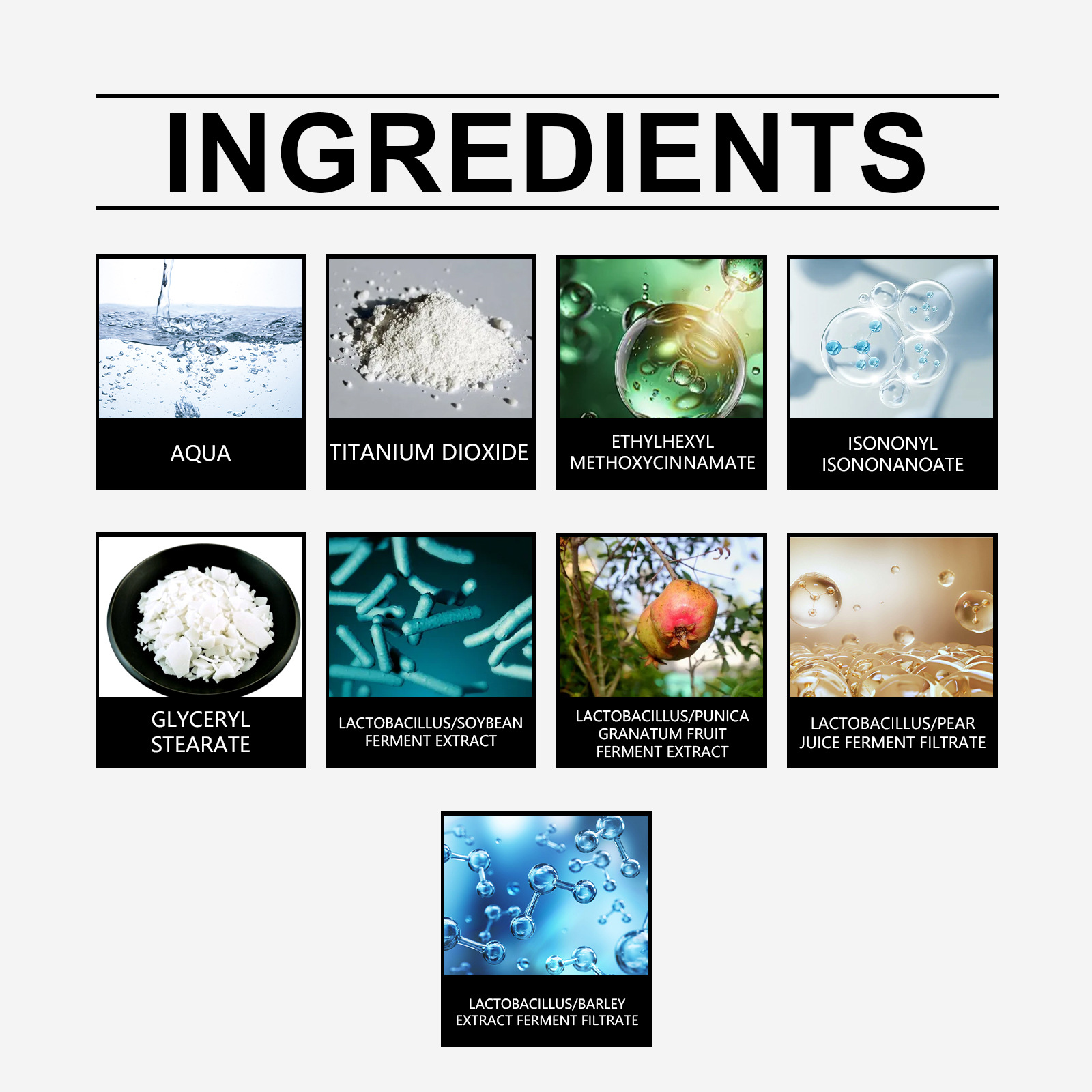 Ingredients: water, titanium dioxide, ethyl hexyl methoxycinnamate, isononyl isonononate, glyceryl stearate, fermented soybean extract, fermented pomegranate extracts, fermented pear extract, fermented barley extract