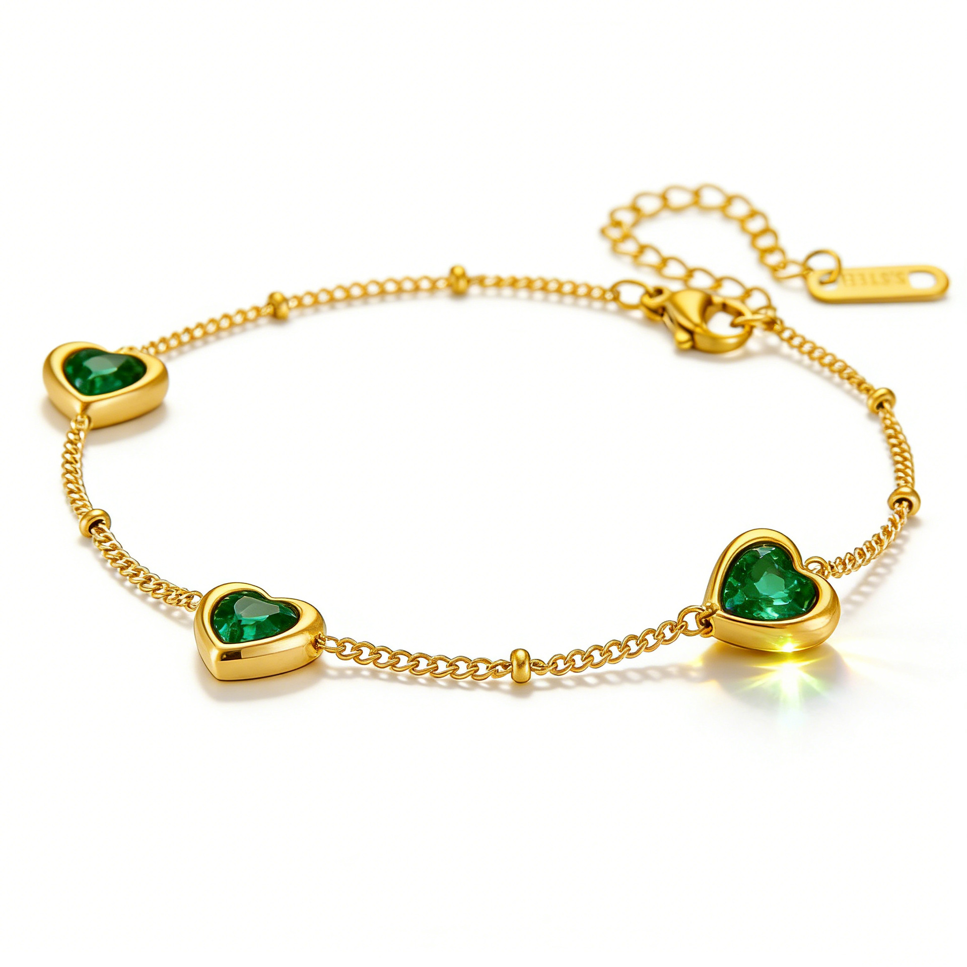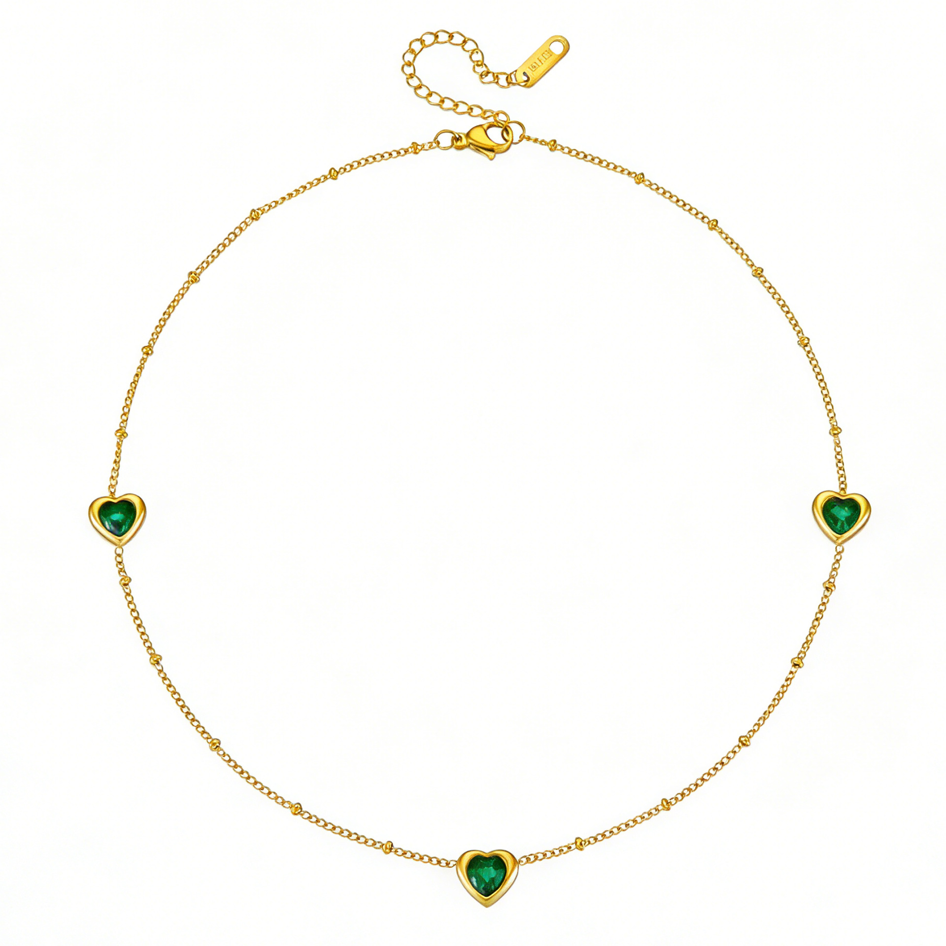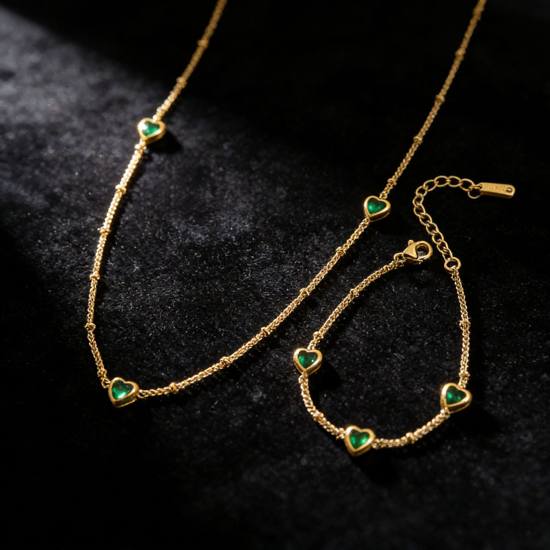 Stainless Steel Necklace And Bracelet With Inlaid Green Diamond Hearts