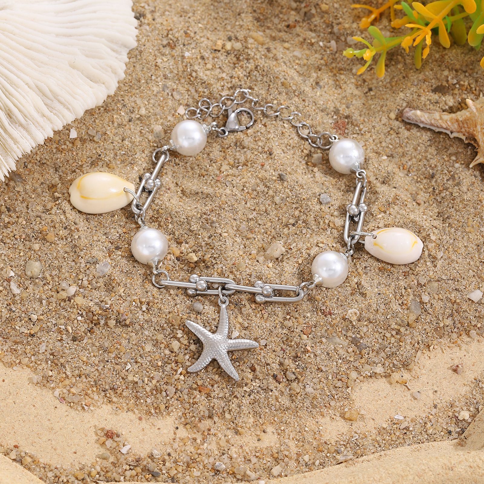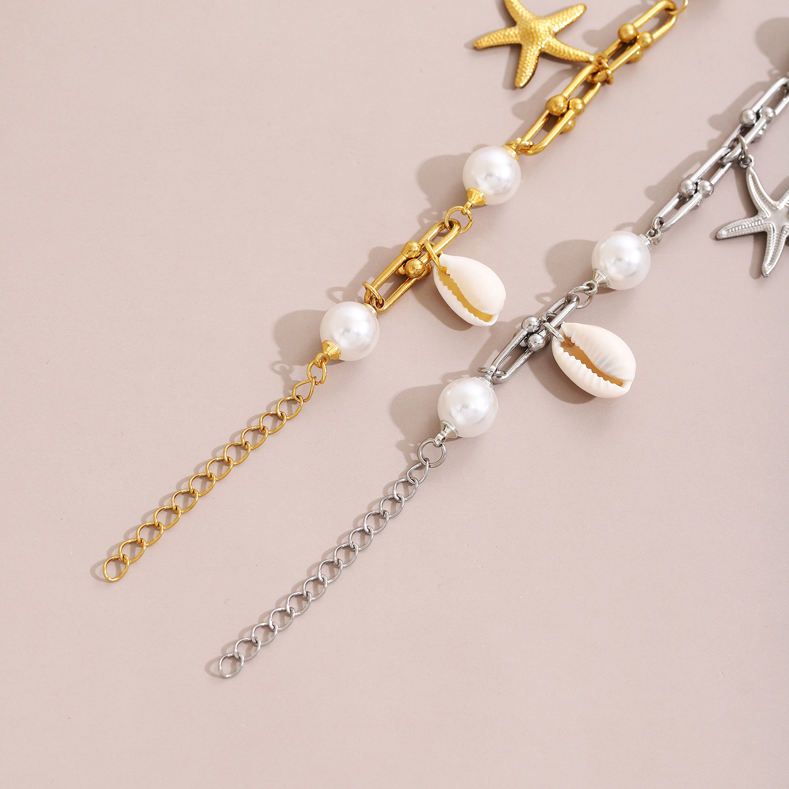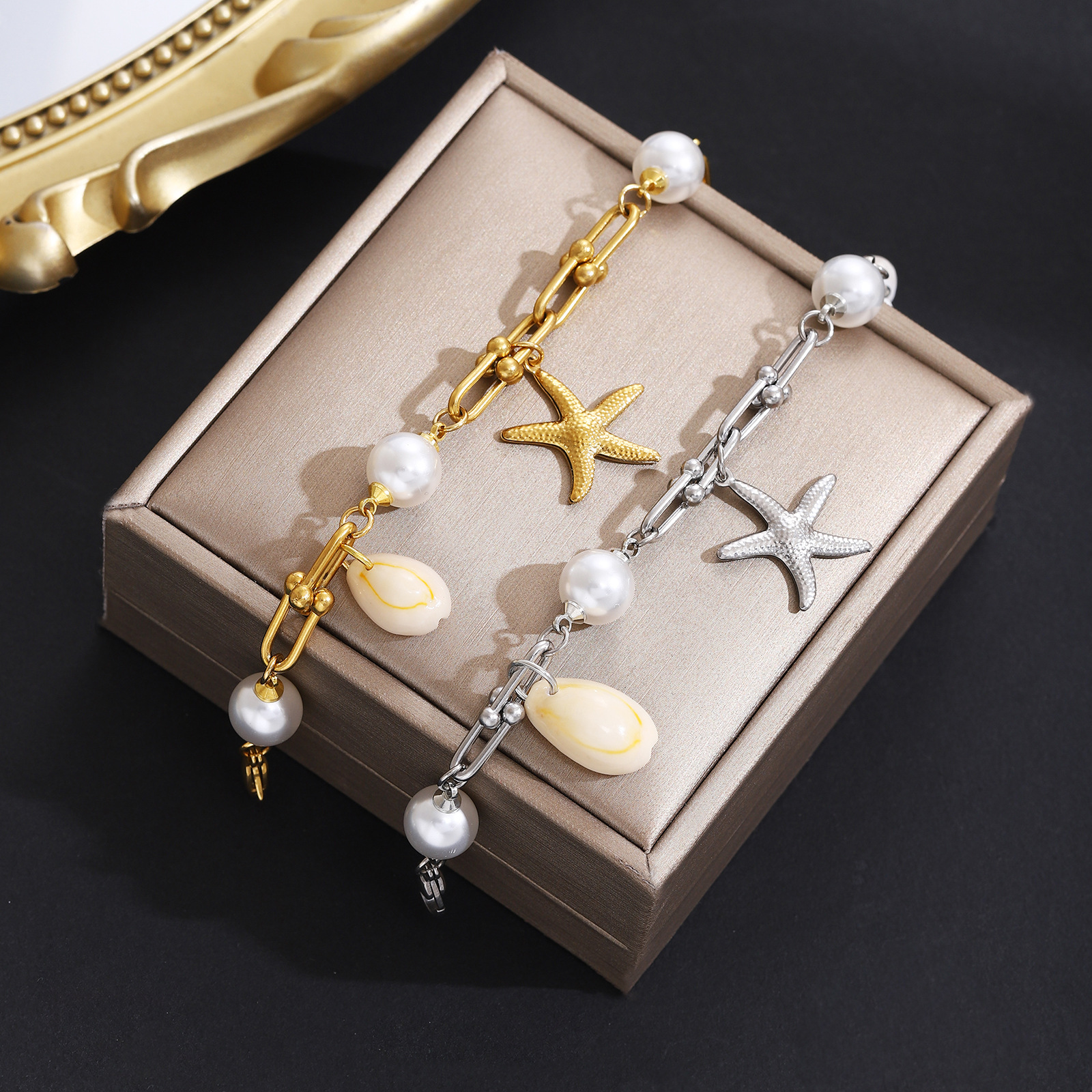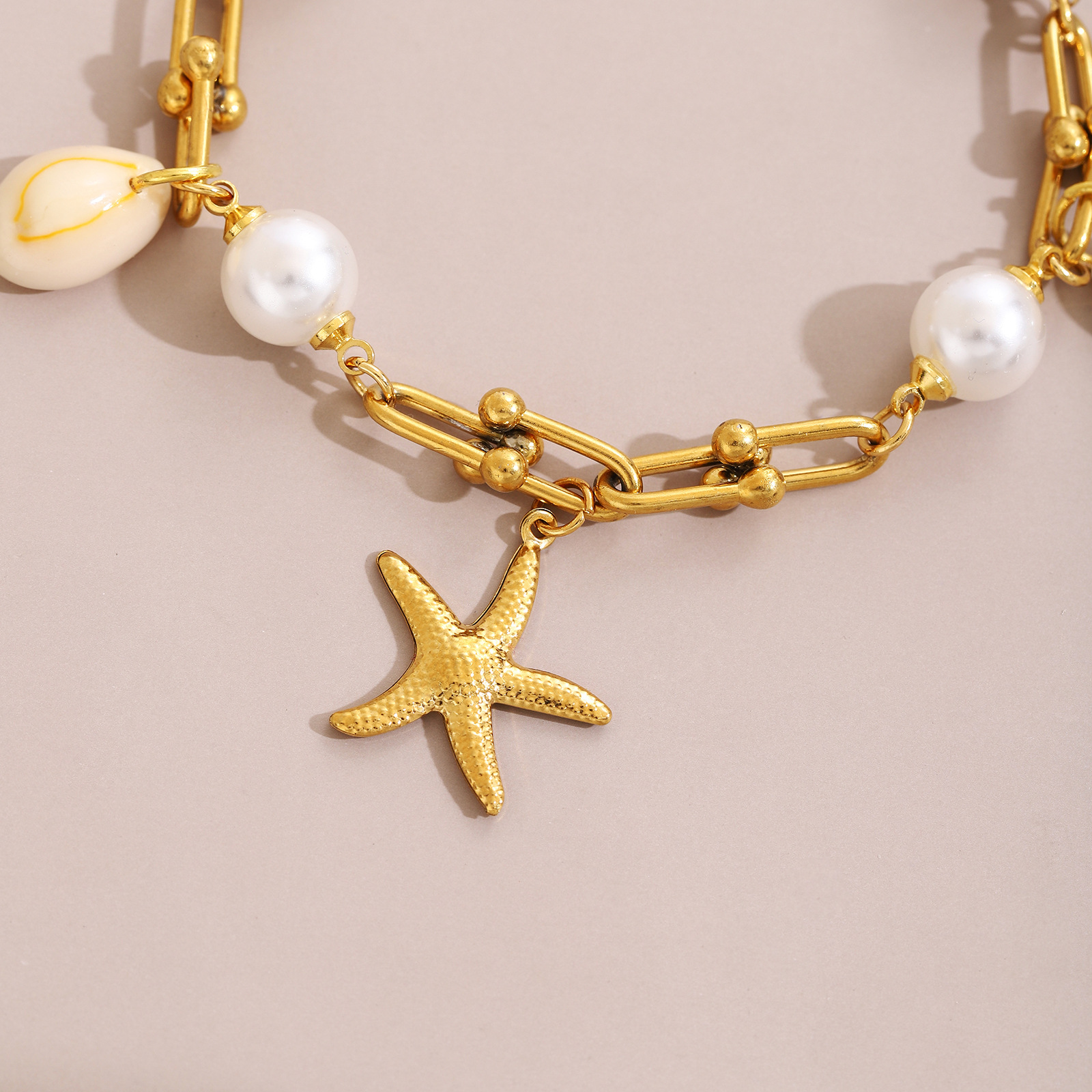 Starfish And Conch Pendant With Pearl, Stainless Steel Horseshoe Chain For Women