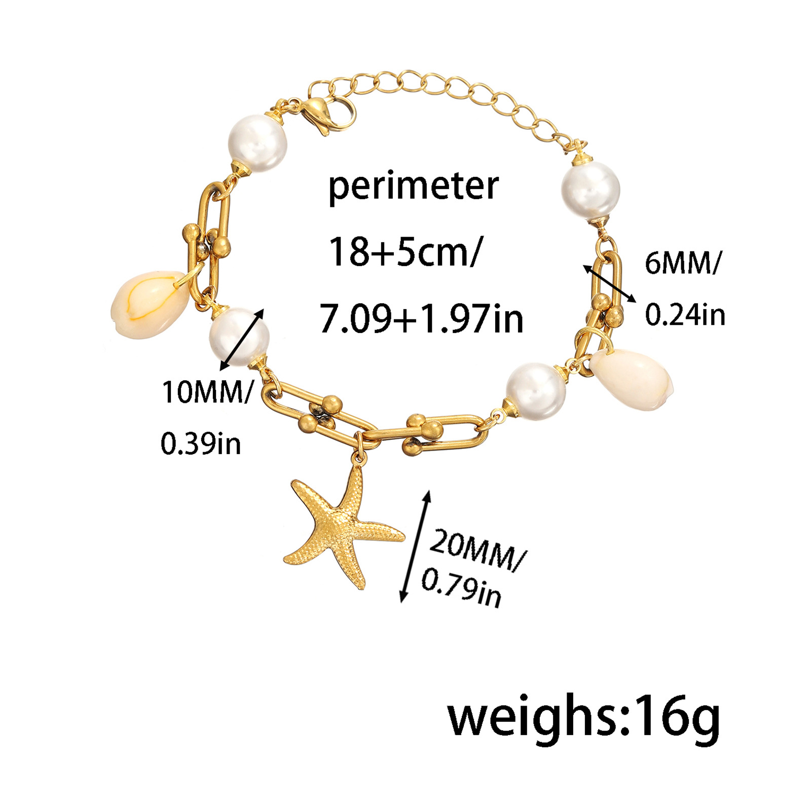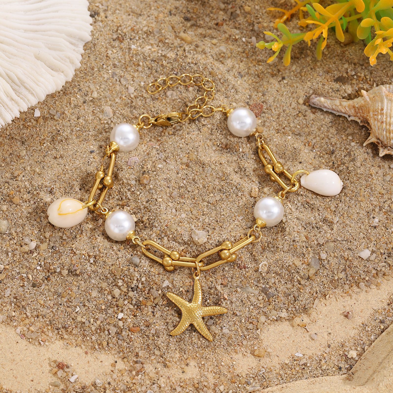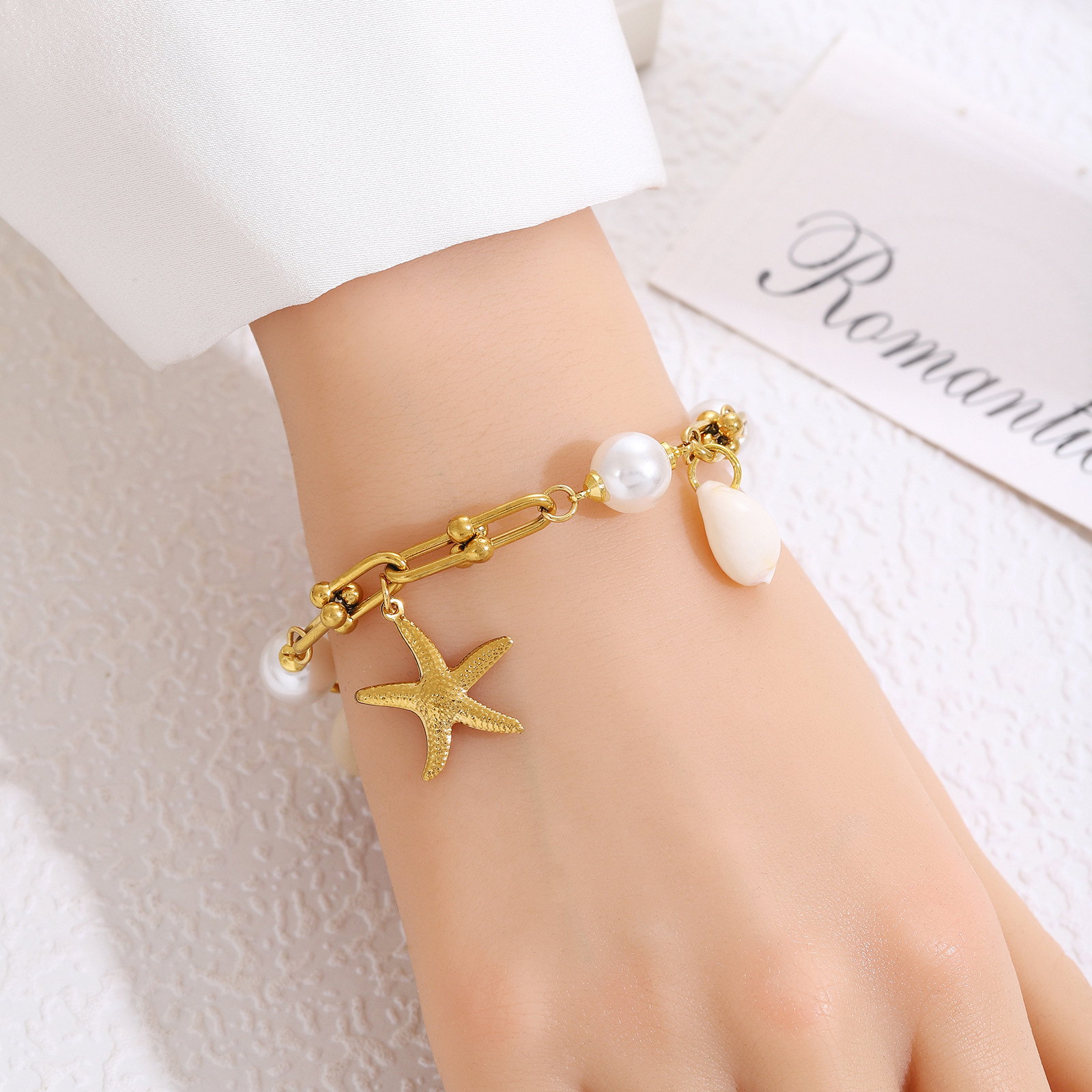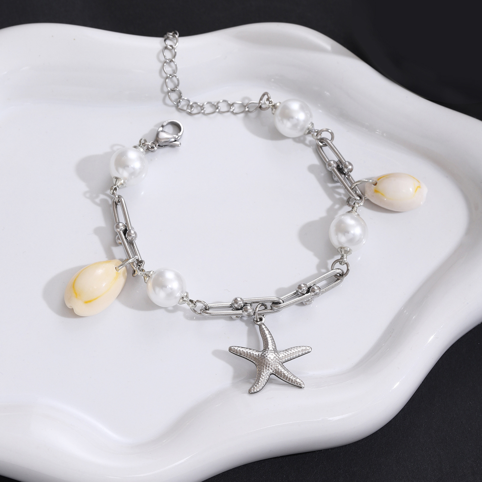 Starfish And Conch Pendant With Pearl, Stainless Steel Horseshoe Chain For Women