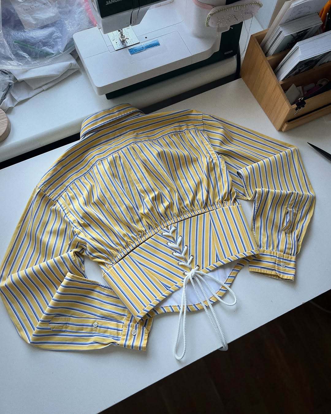 Colors: Blue pinstripes, black, pink, yellow, blue wide stripes