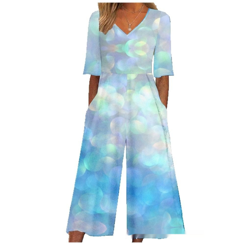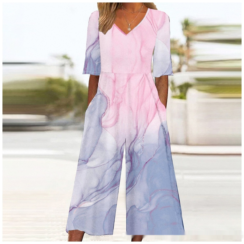 Summer Elegant V-Neck Jumpsuit With Three-Quarter Sleeves And Wide Legs