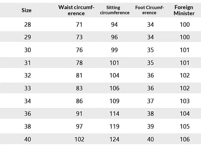 Sizes: 28, 29, 30, 31, 32, 33, 34, 36, 38, 40