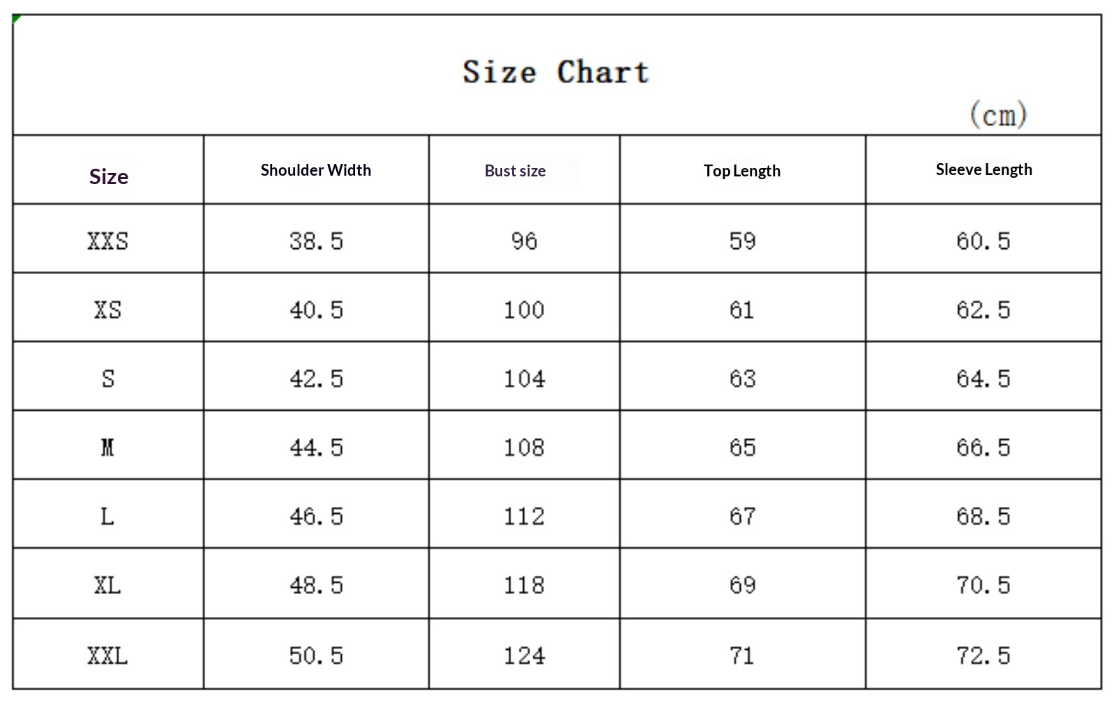 Size: XXS, XS, S, M, L, XL, XXL