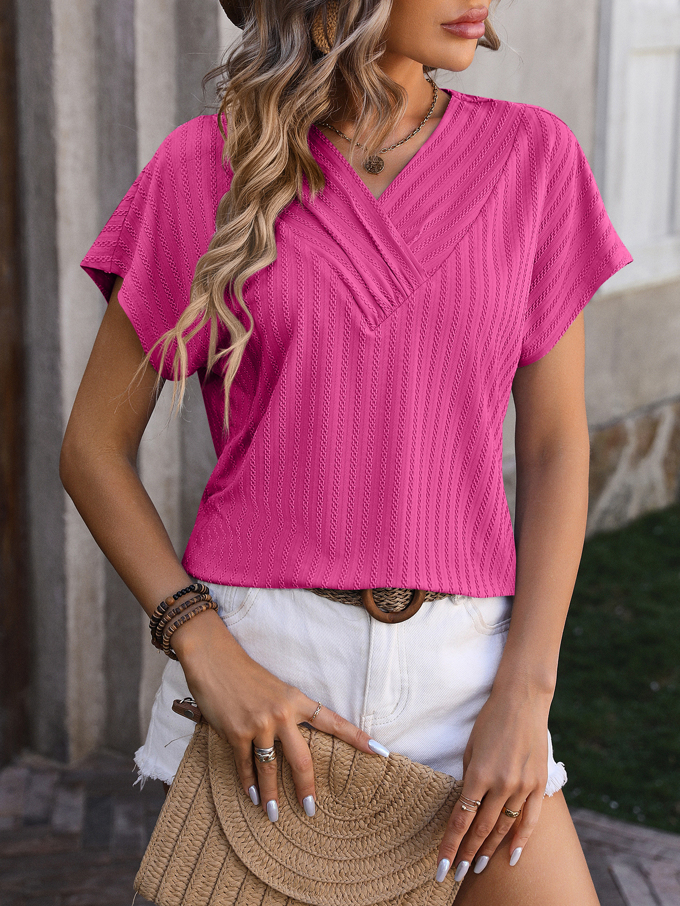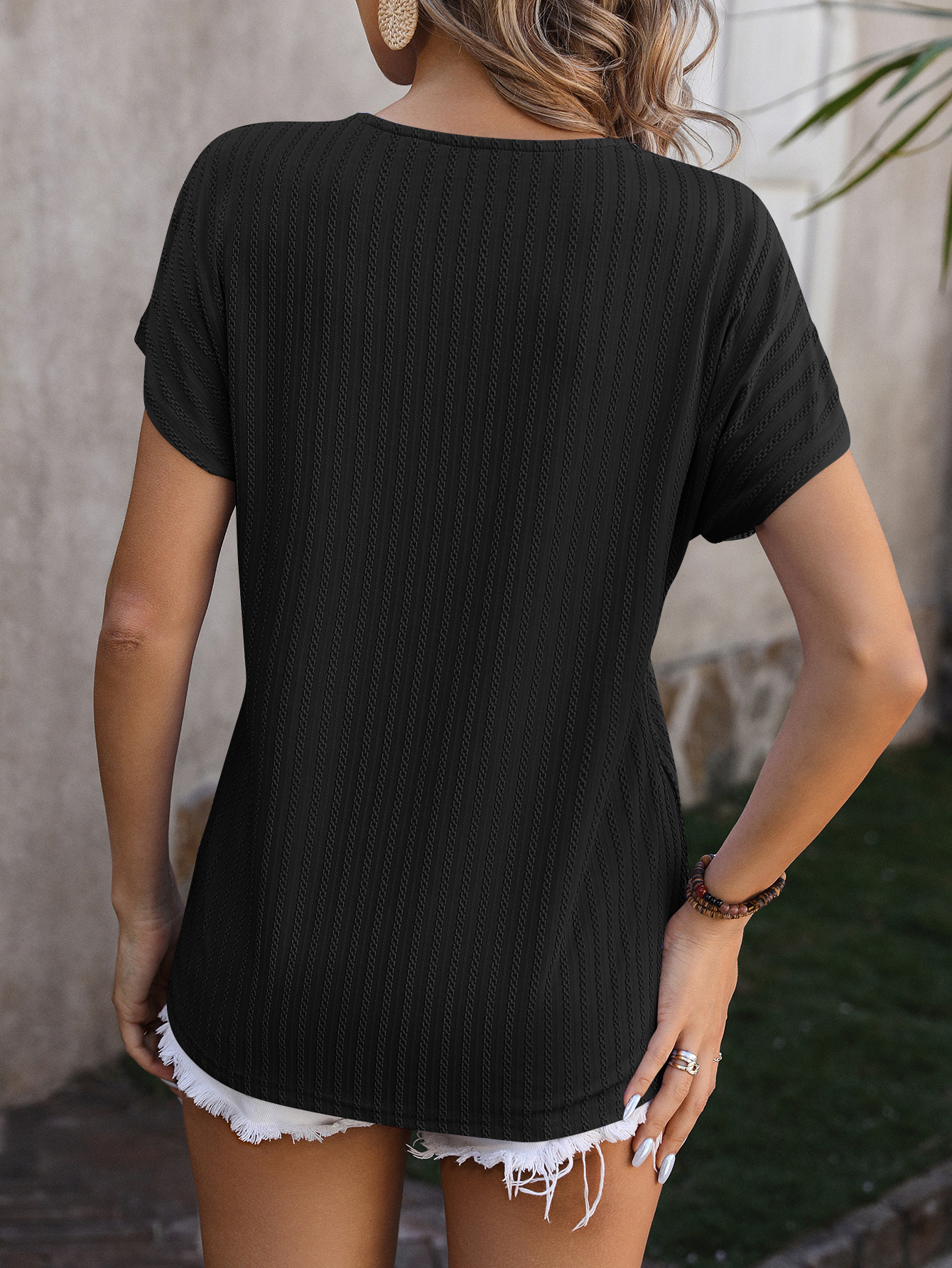 Women's V-Neck Chain Jacquard Top Short-Sleeve T-Shirt