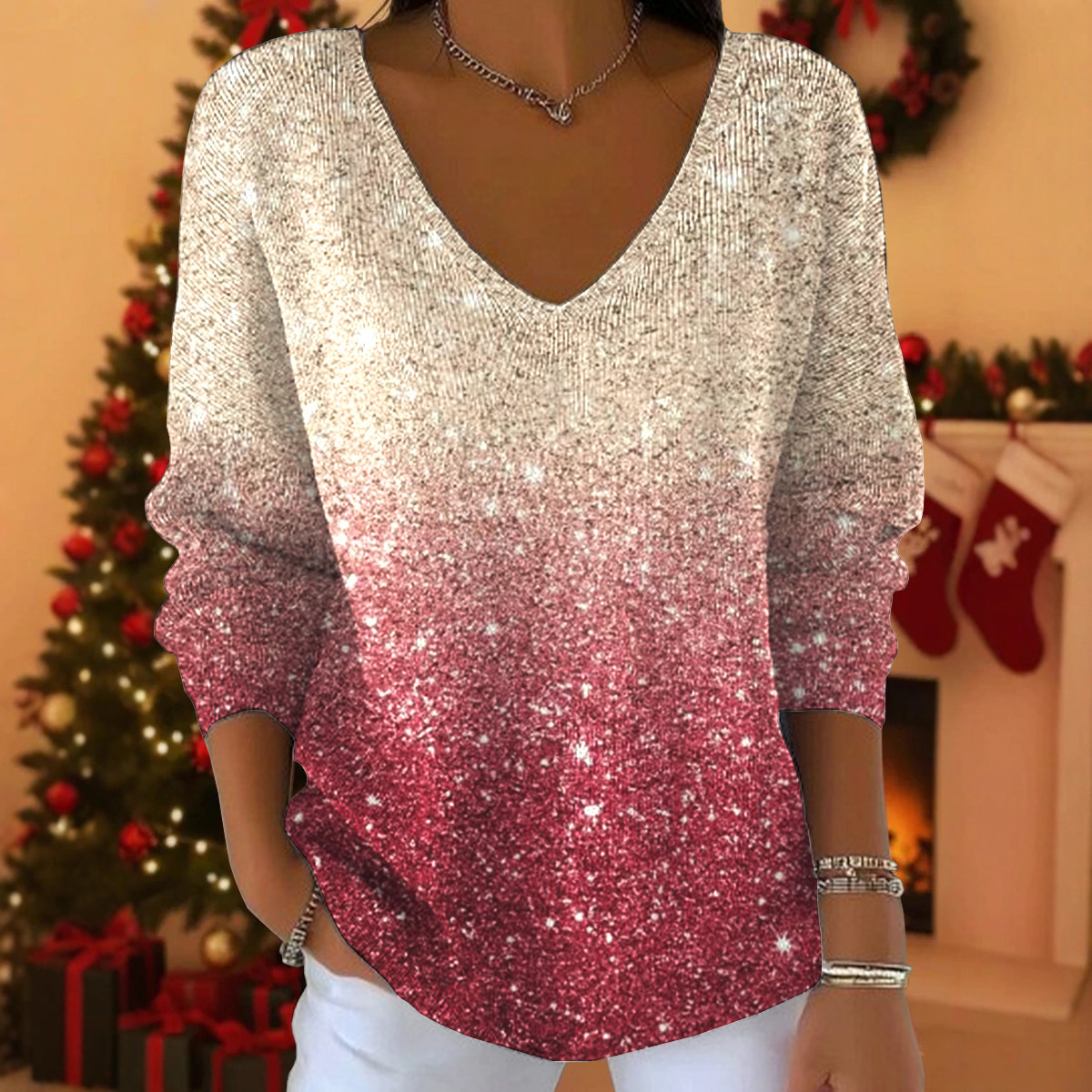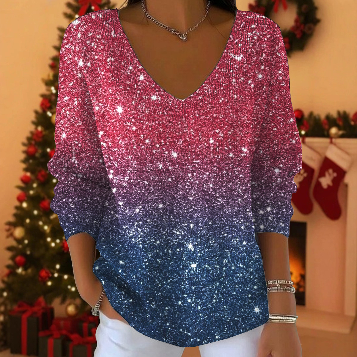 Womens 3D Digital-Print Drop-Shoulder V-Neck Long-Sleeve Pullover Top