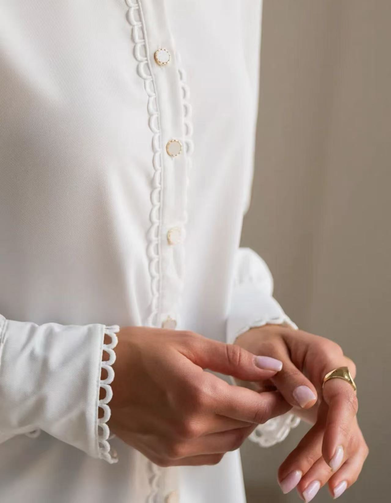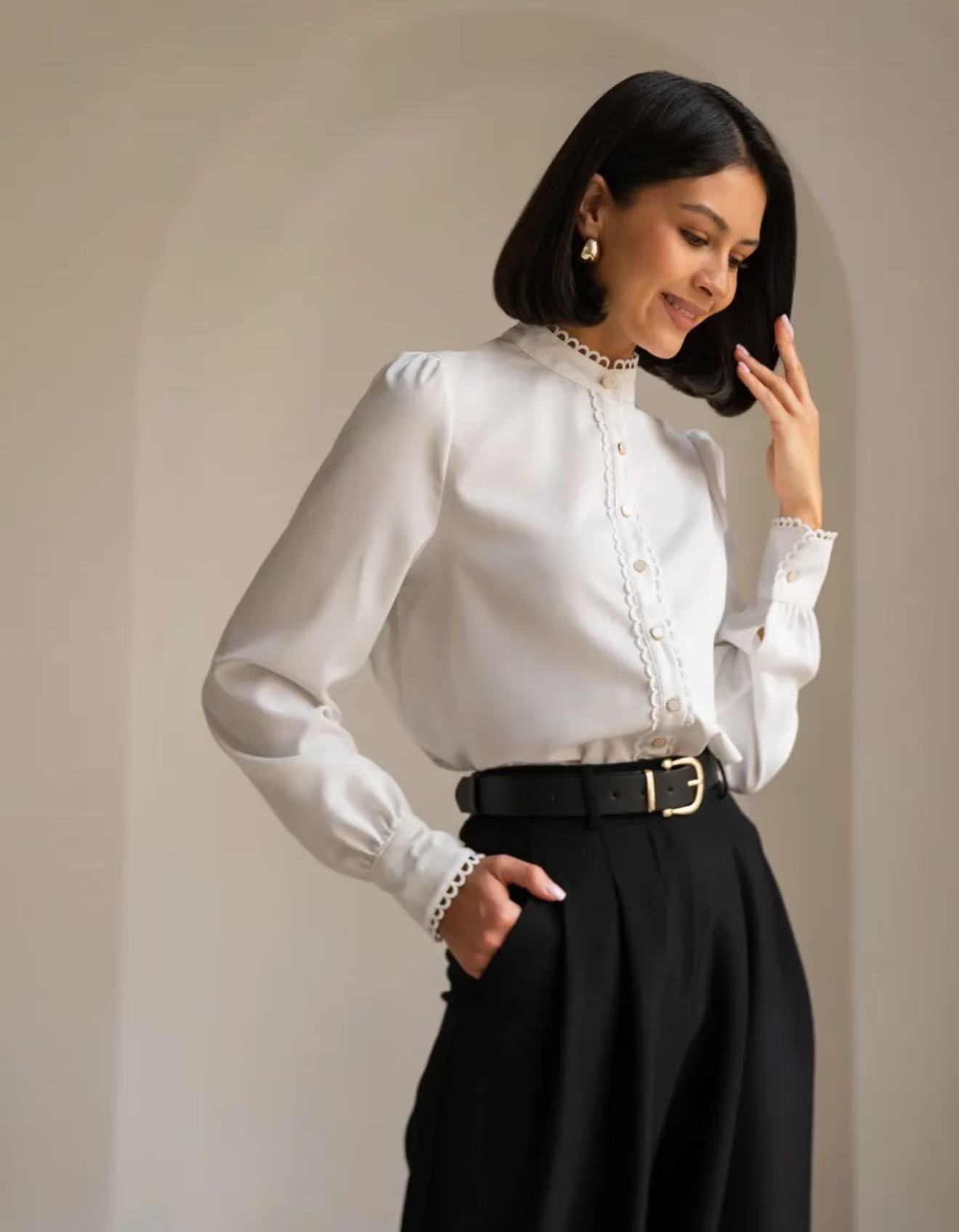 Womens Designer White Lace Long-Sleeve Blouse With Embellished Edges