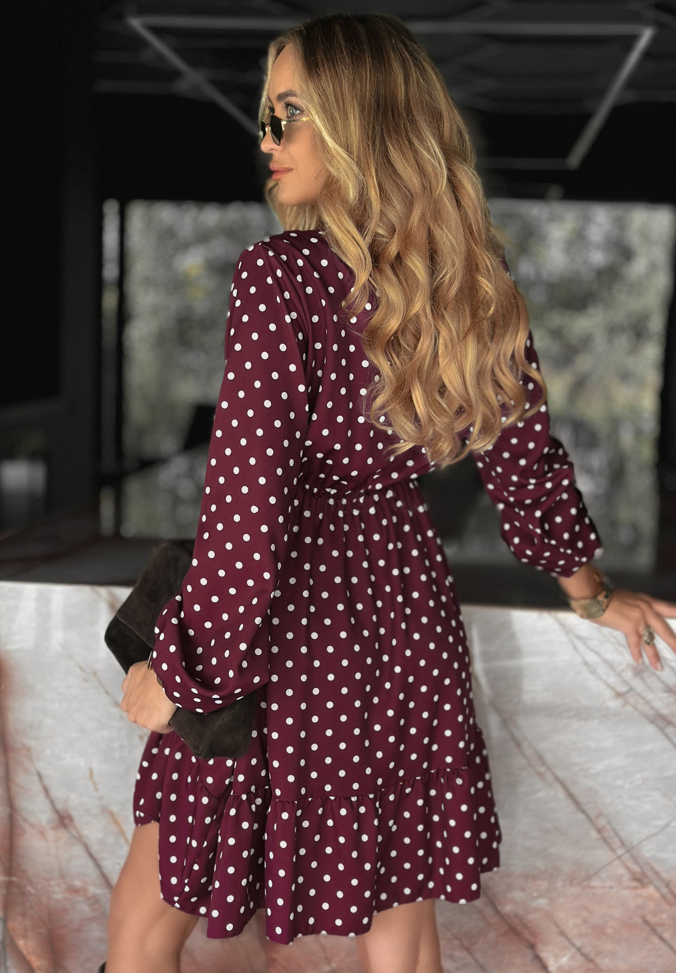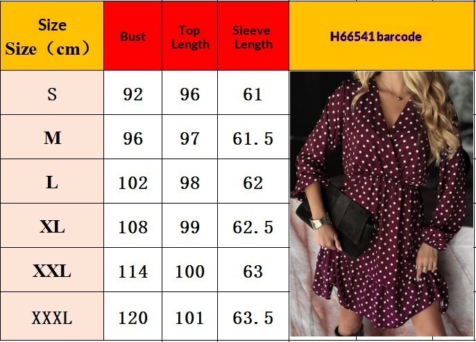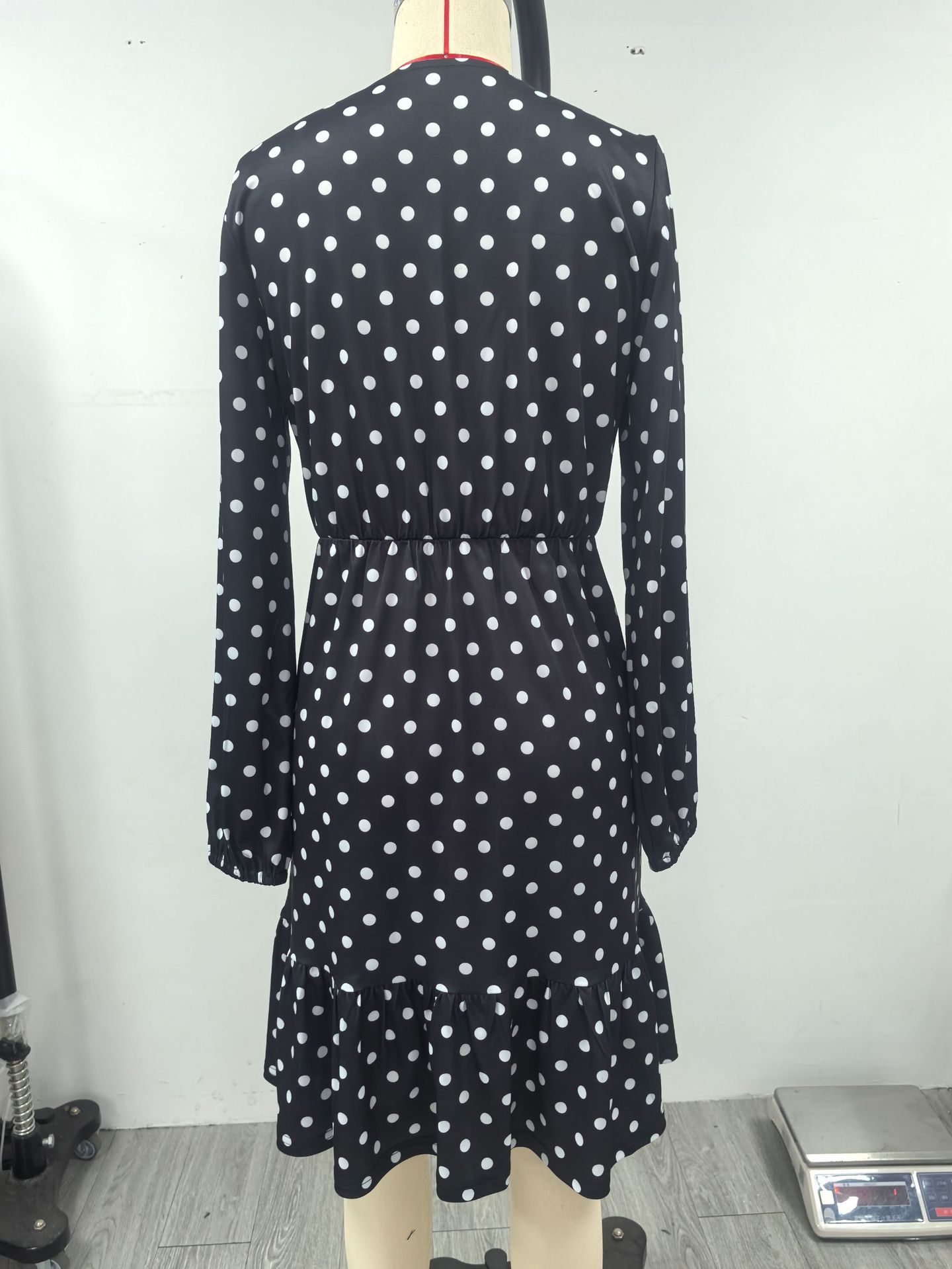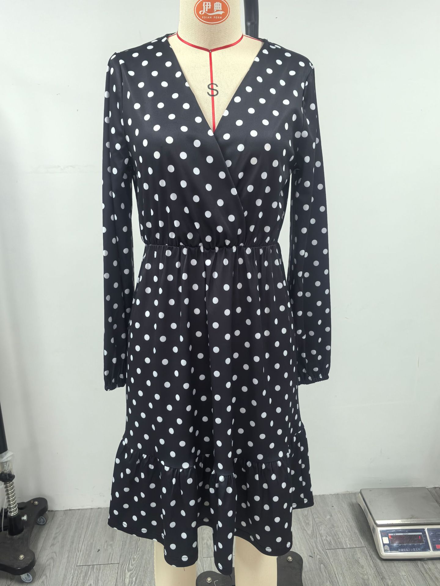 Womens Fashion Polka-Dot V-Neck Long-Sleeve Elastic-Waist Dress