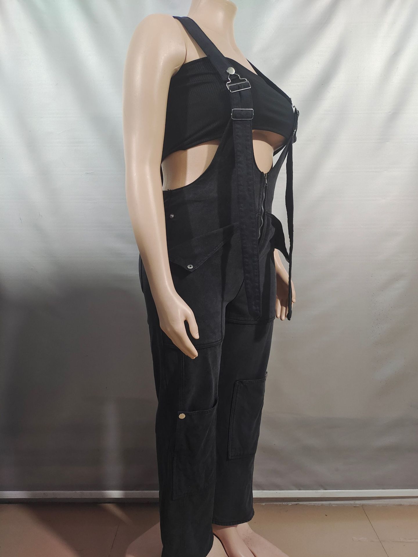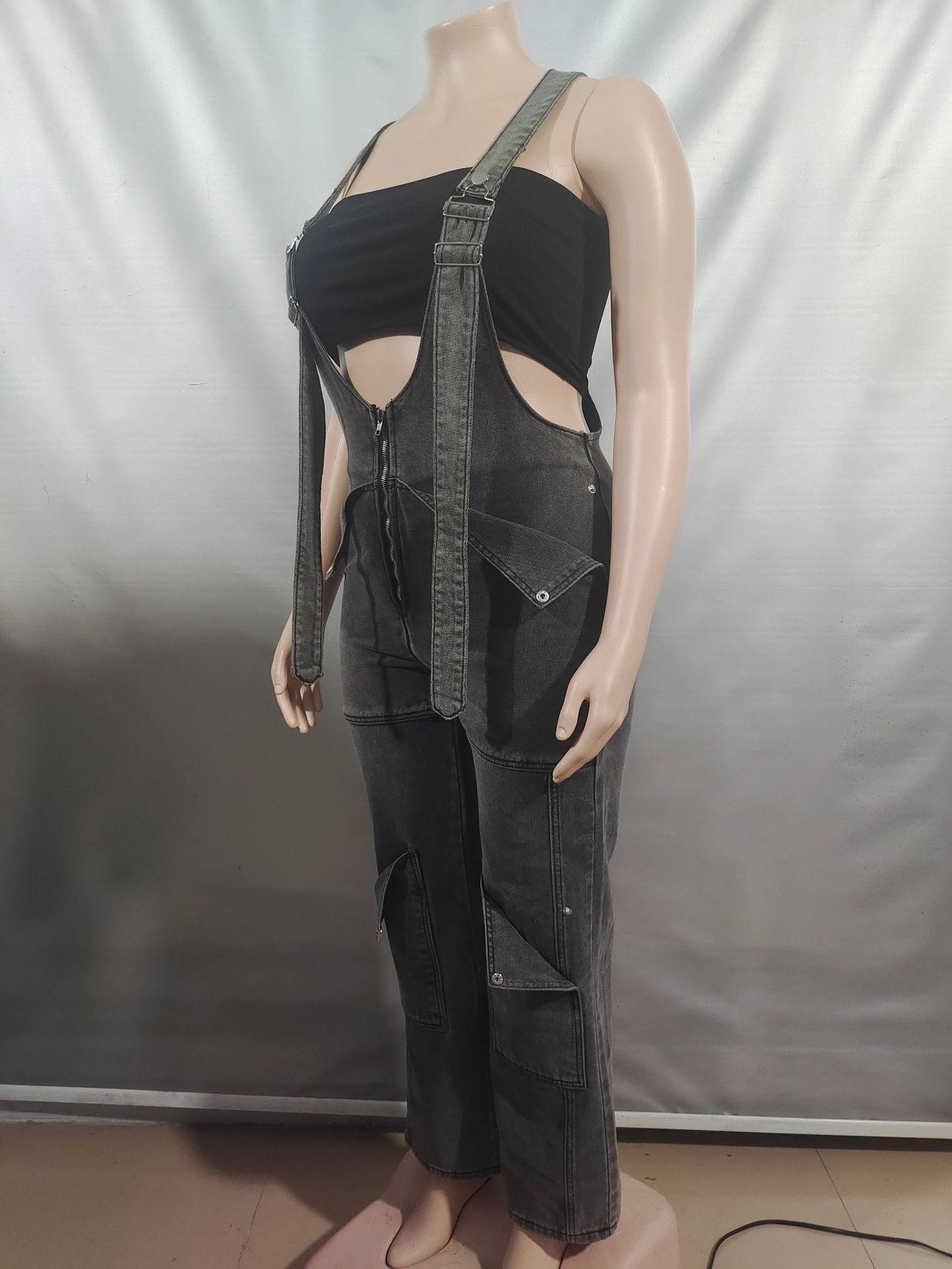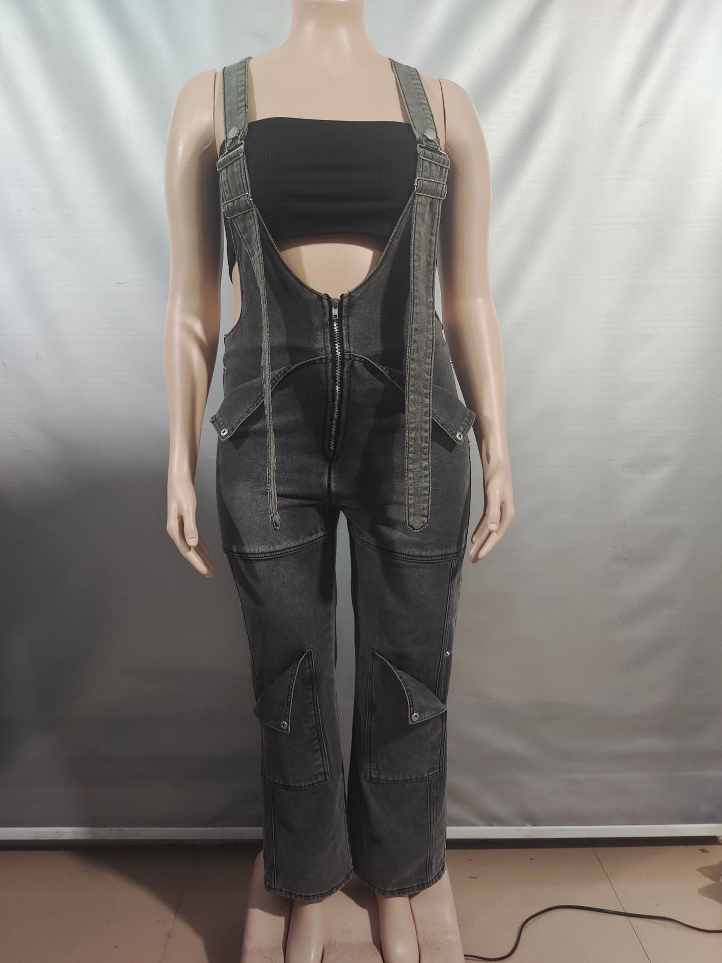 Womens Solid-Color Casual Washed Denim Suspender Overalls With Zipper