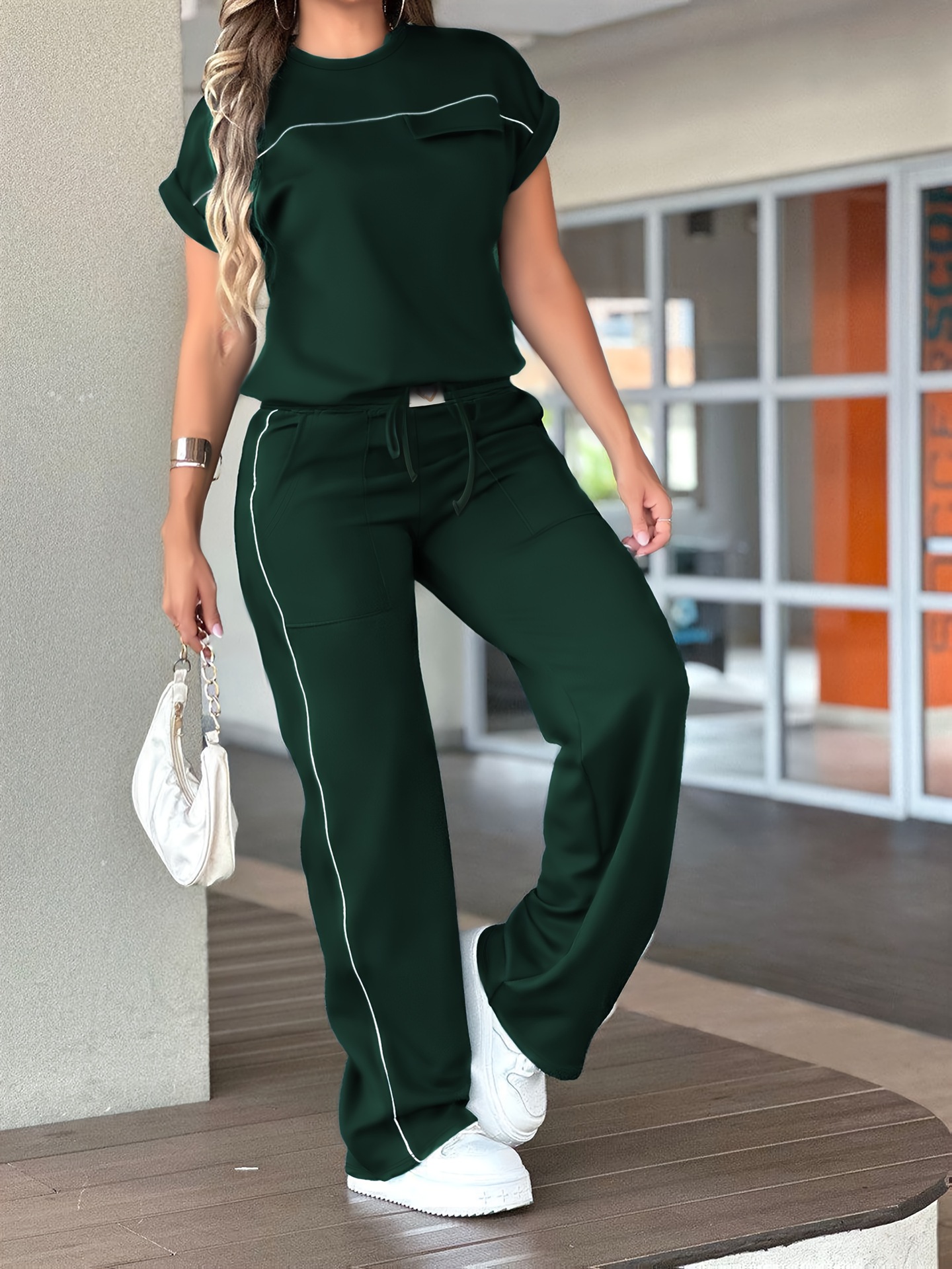 Womens Solid-Color Simple Crew-Neck Short-Sleeve Top And Straight-Leg Pants Set