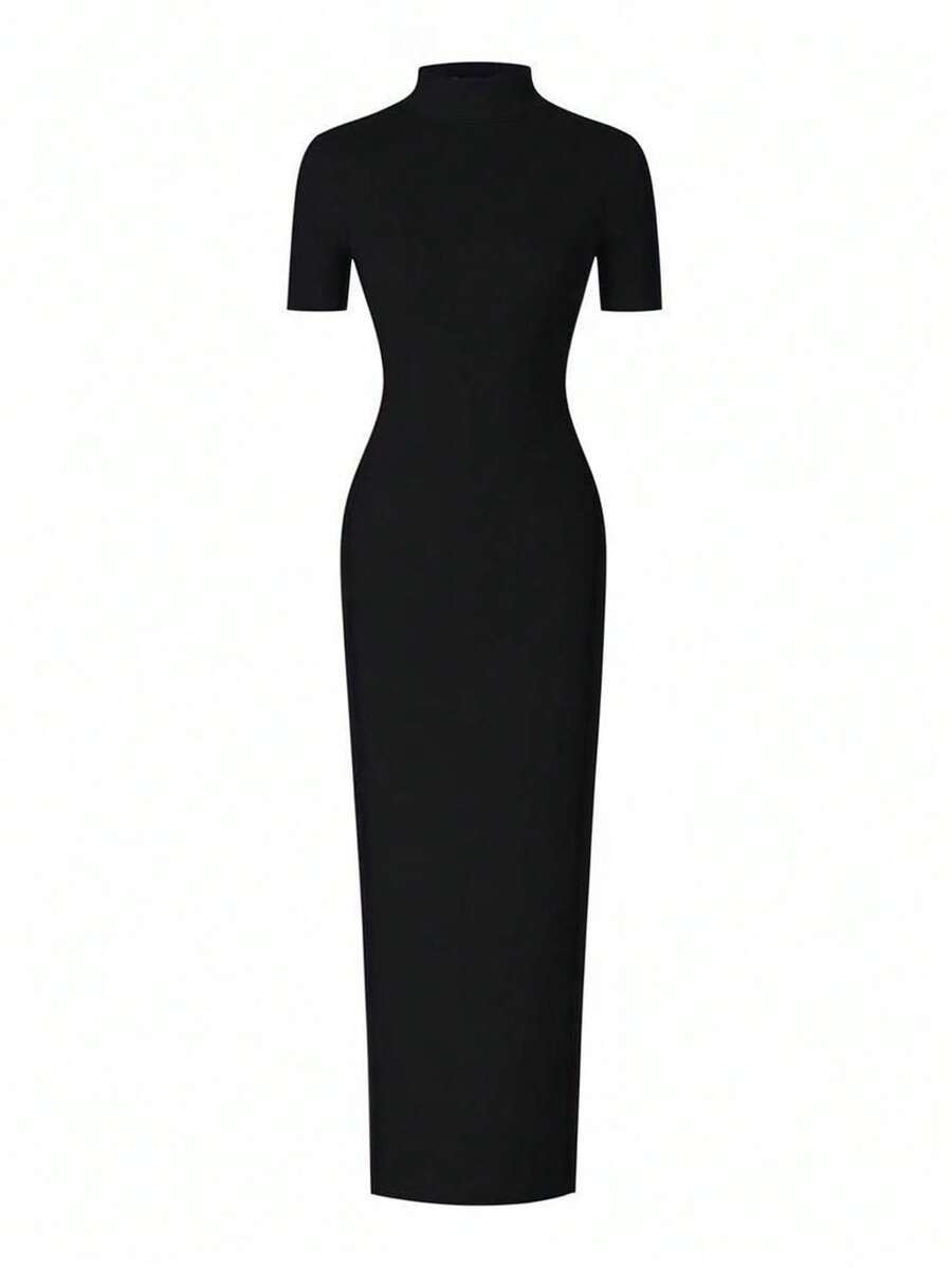 0 Review for Womens Solid-Colored Short-Sleeve Mock Neck Pleated Slit Dress